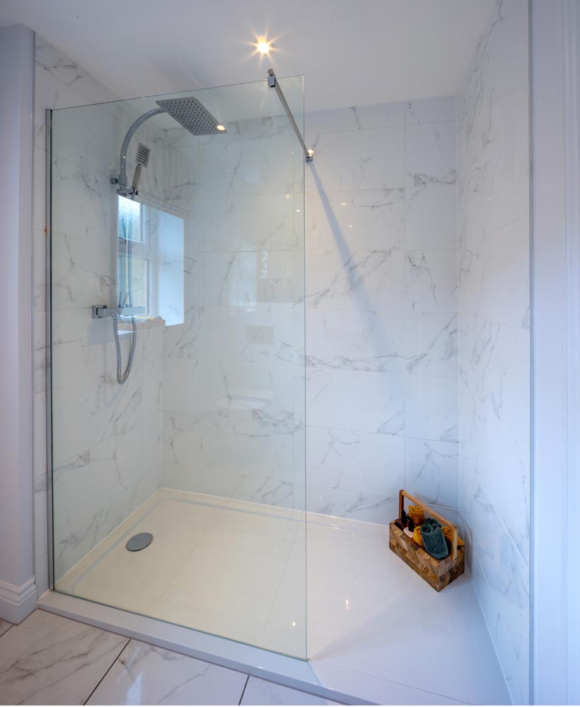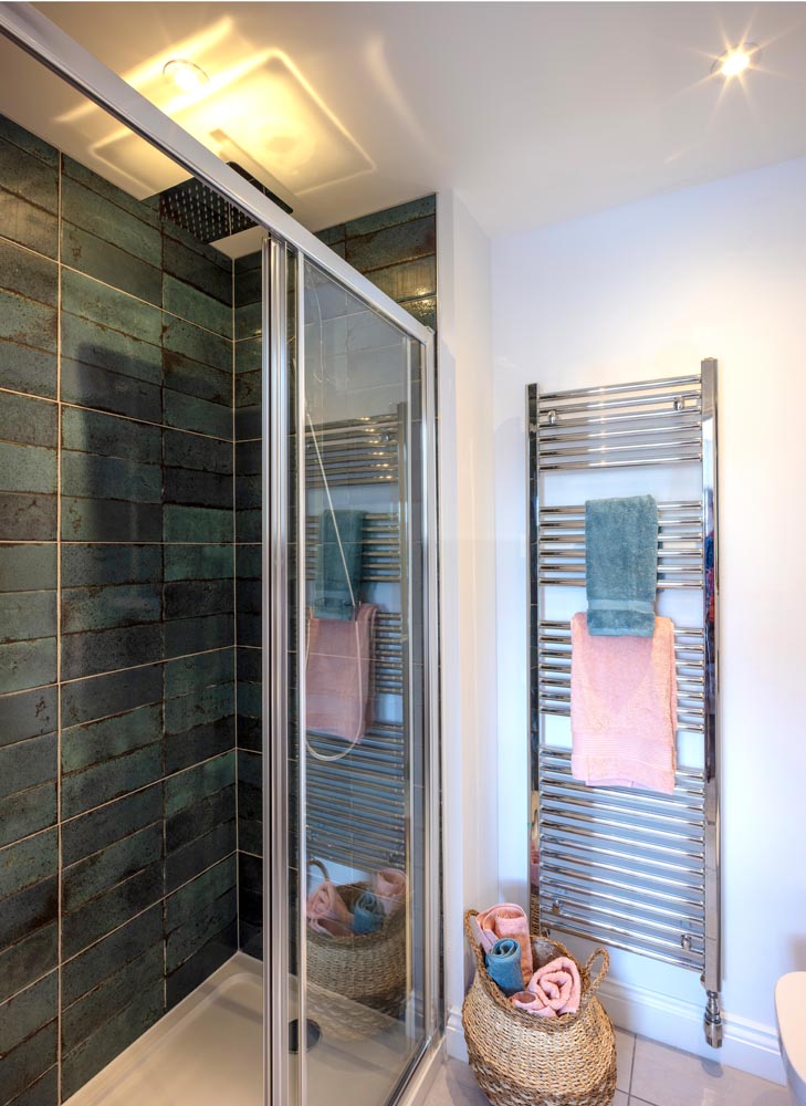 Bathrooms and en-suites are finished with a clean, contemporary approach, featuring chrome sanitaryware and fittings, with en-suites benefiting from glass shower enclosures and rainfall-style showers. Porcelanosa tiling is used throughout, creating a cohesive and durable finish.
