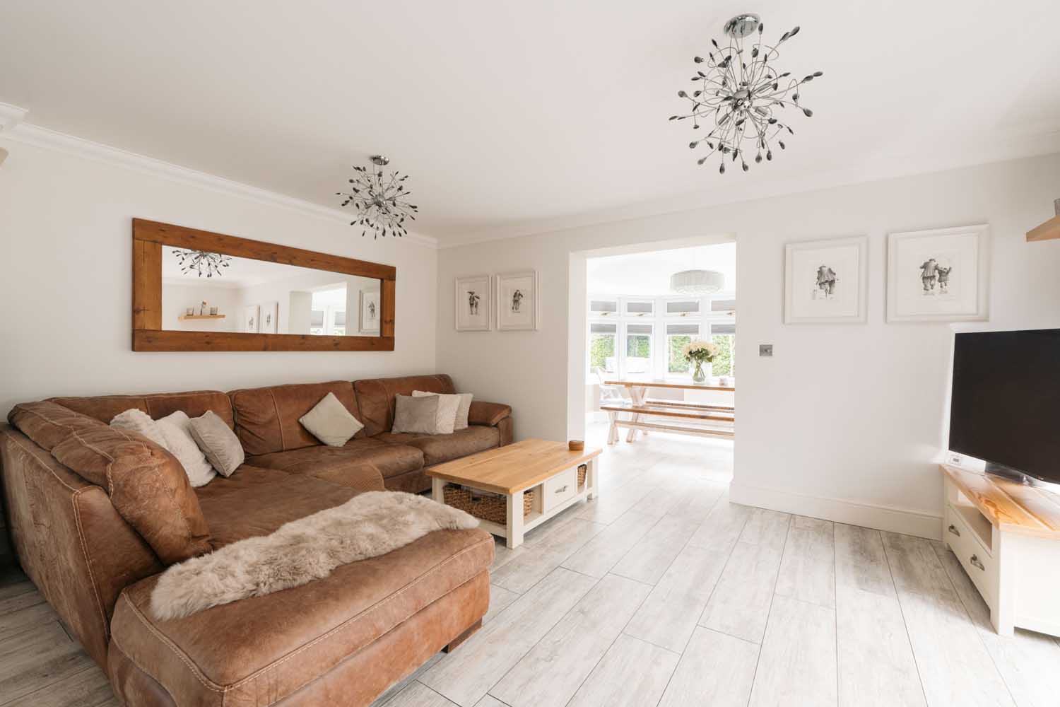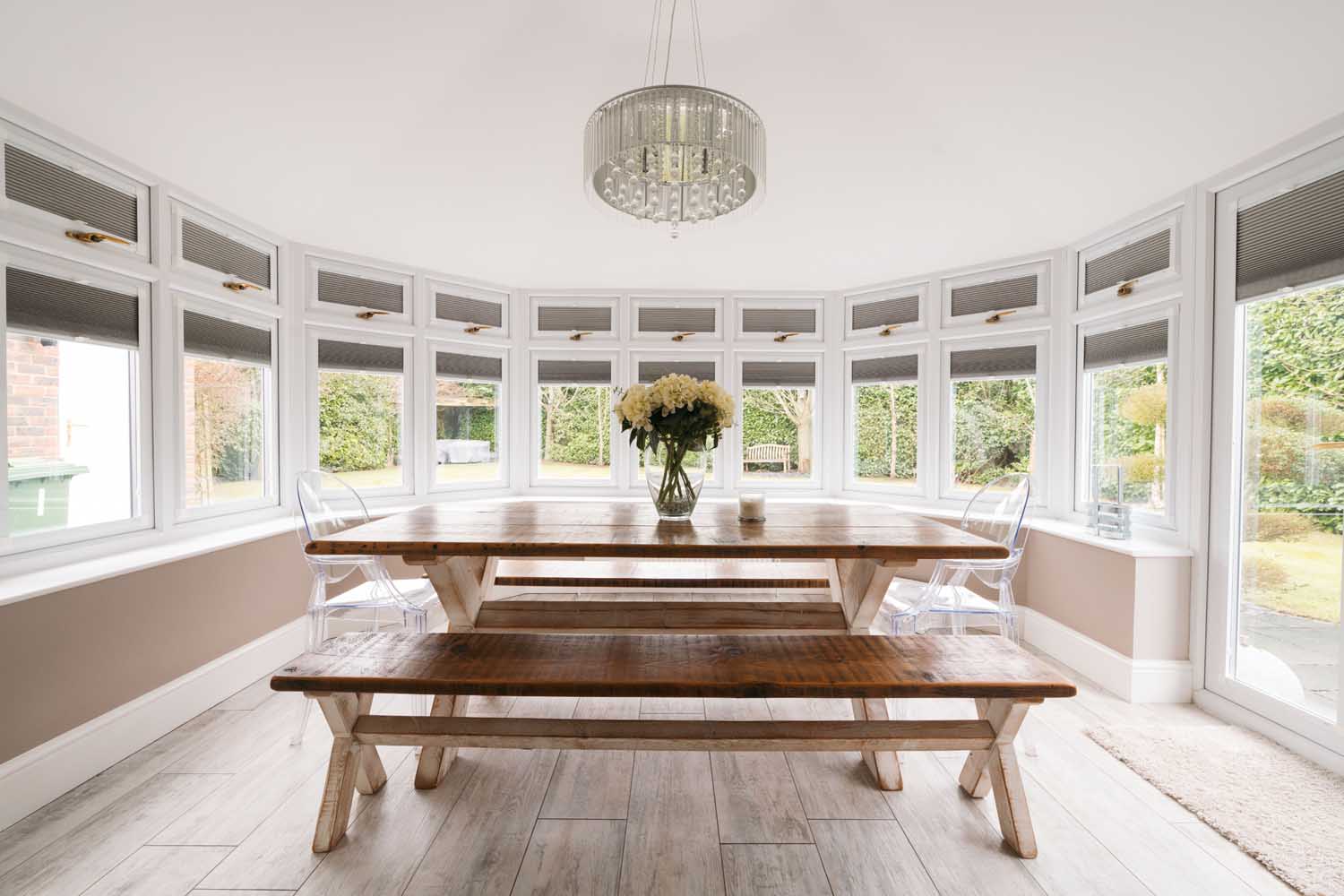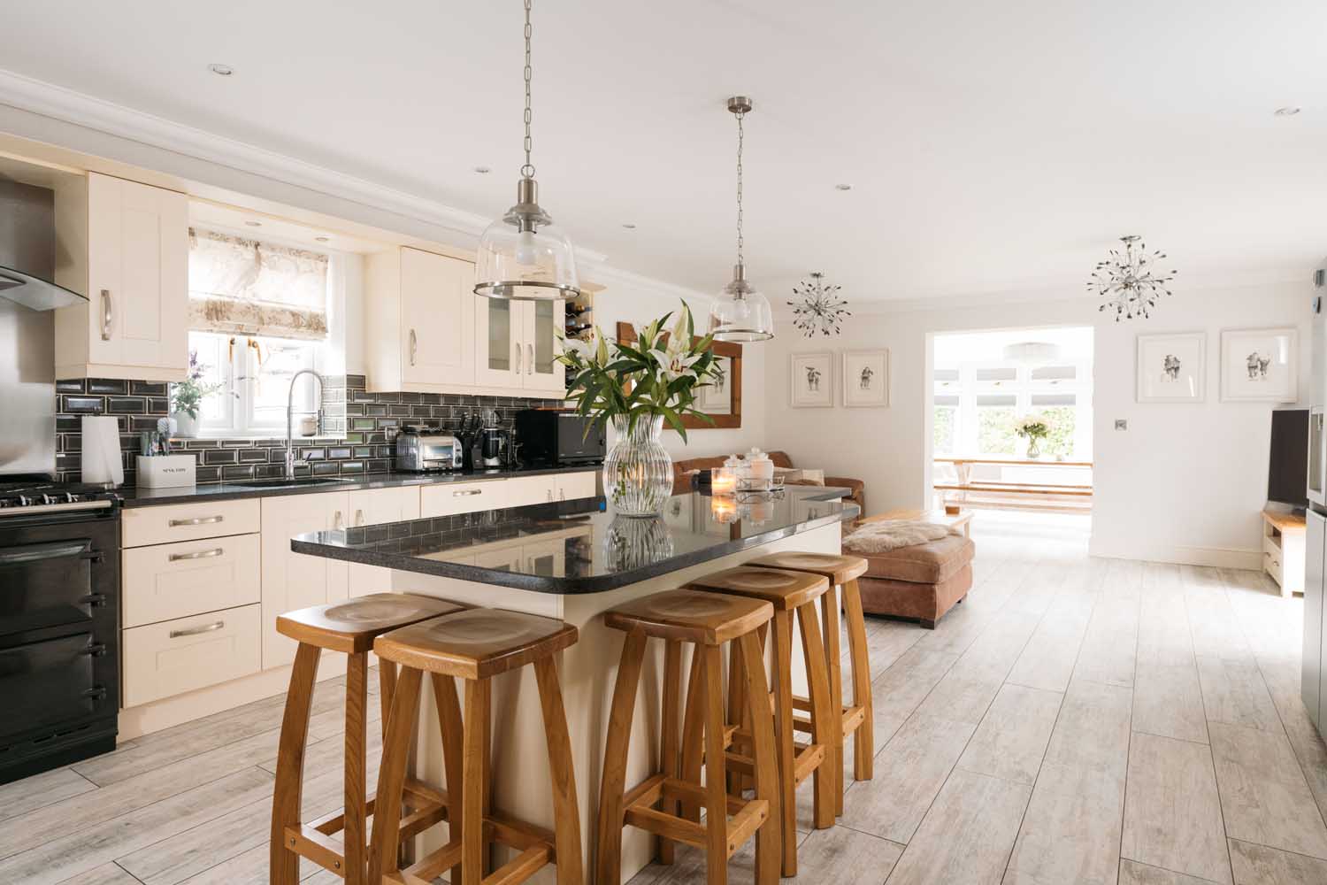 The kitchen forms the heart of the home. It includes shaker-style floor and wall-mounted units, granite countertops, and a central island. The appliances comprise an AGA oven and a six-ring gas hob, with additional storage offered by a built-in pantry and cupboard. The kitchen extends into a seating area with direct garden access and an open archway leading to a previously used conservatory space. This room now features permanent walls and ceiling, ample windows, doors to the garden, and underfloor heating. Supporting the kitchen is a utility room with additional cabinets, space and plumbing for a washing machine and tumble dryer, and side access.