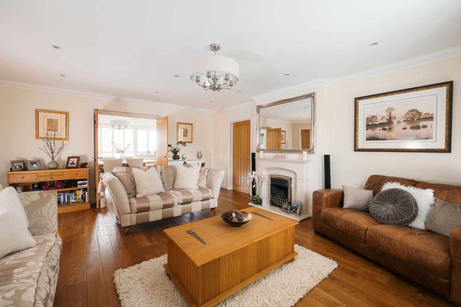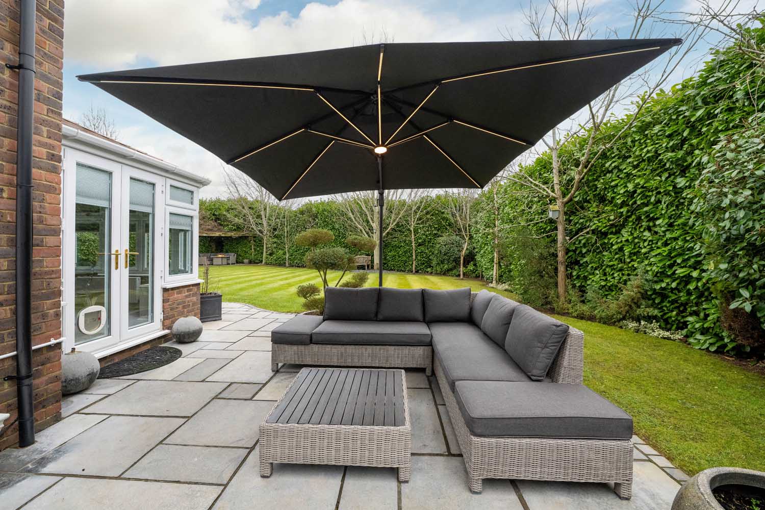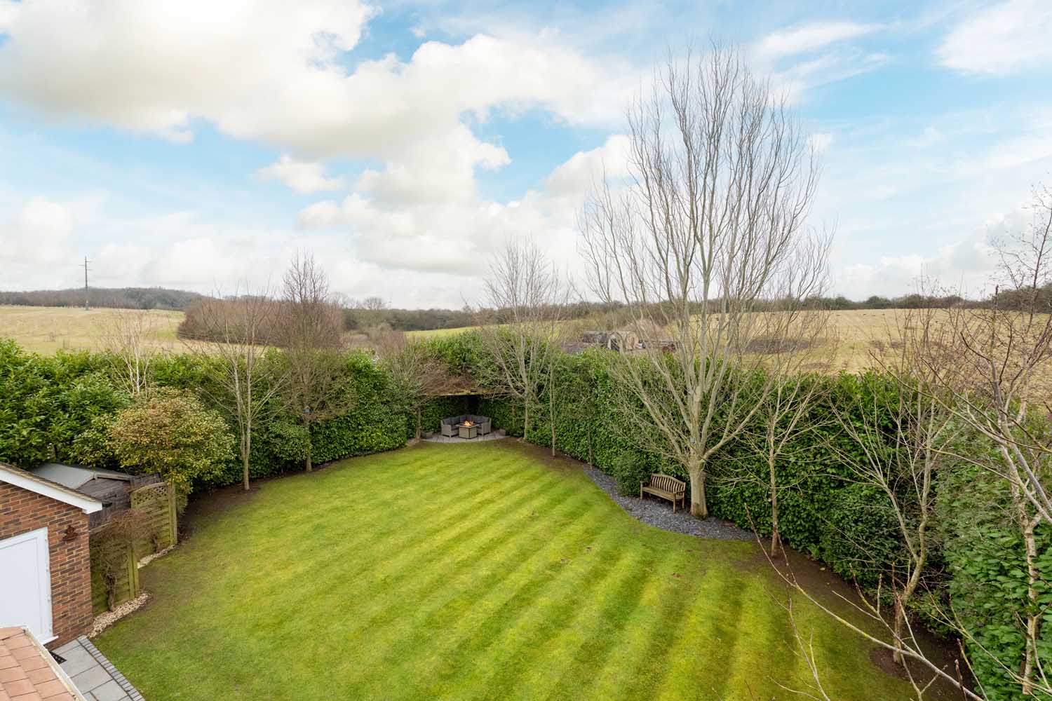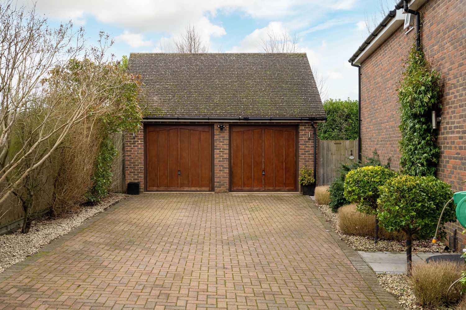 The rear of the property offers a private and well-established garden with mature shrubs, trees, and neatly maintained lawns, all complemented by a welcoming patio. Overlooking open fields. Thoughtfully designed, the garden serves as a relaxing retreat, complete with a hot tub. The front driveway has space for six cars and a double garage with electric doors, an electric vehicle charger has also been installed. The front garden is laid to lawn.