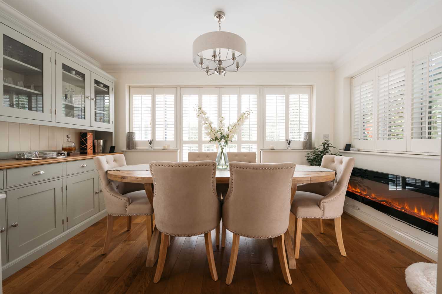 The ground floor features a spacious entrance hallway. On one side, the first reception room is a flexible space, currently used as a sitting room but previously used as a study and a playroom. Opposite, the main sitting room has a gas-burning stove and bespoke shutters framing views of the front garden. The dining room, accessed via double doors, includes French doors opening to the rear garden. Adjacent to the sitting room is a large study with a front-facing window.