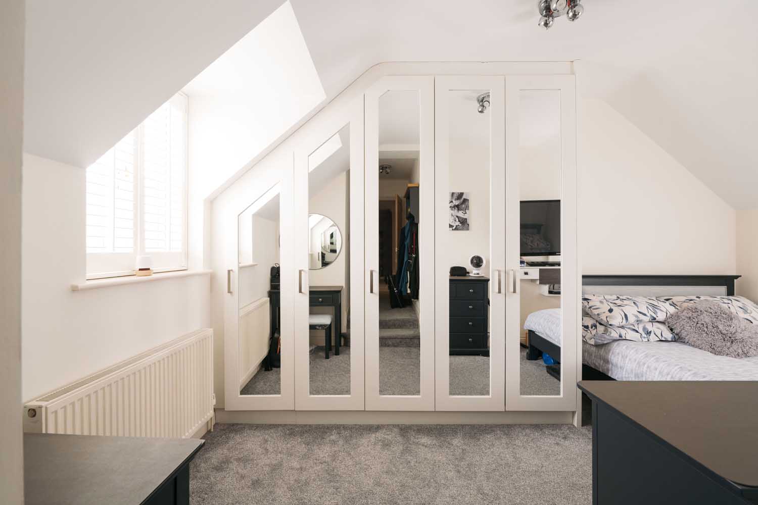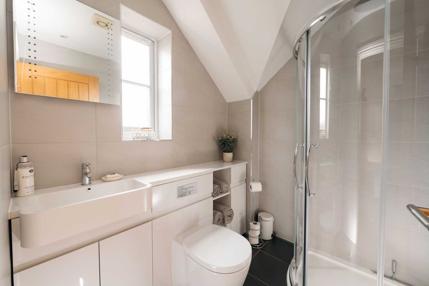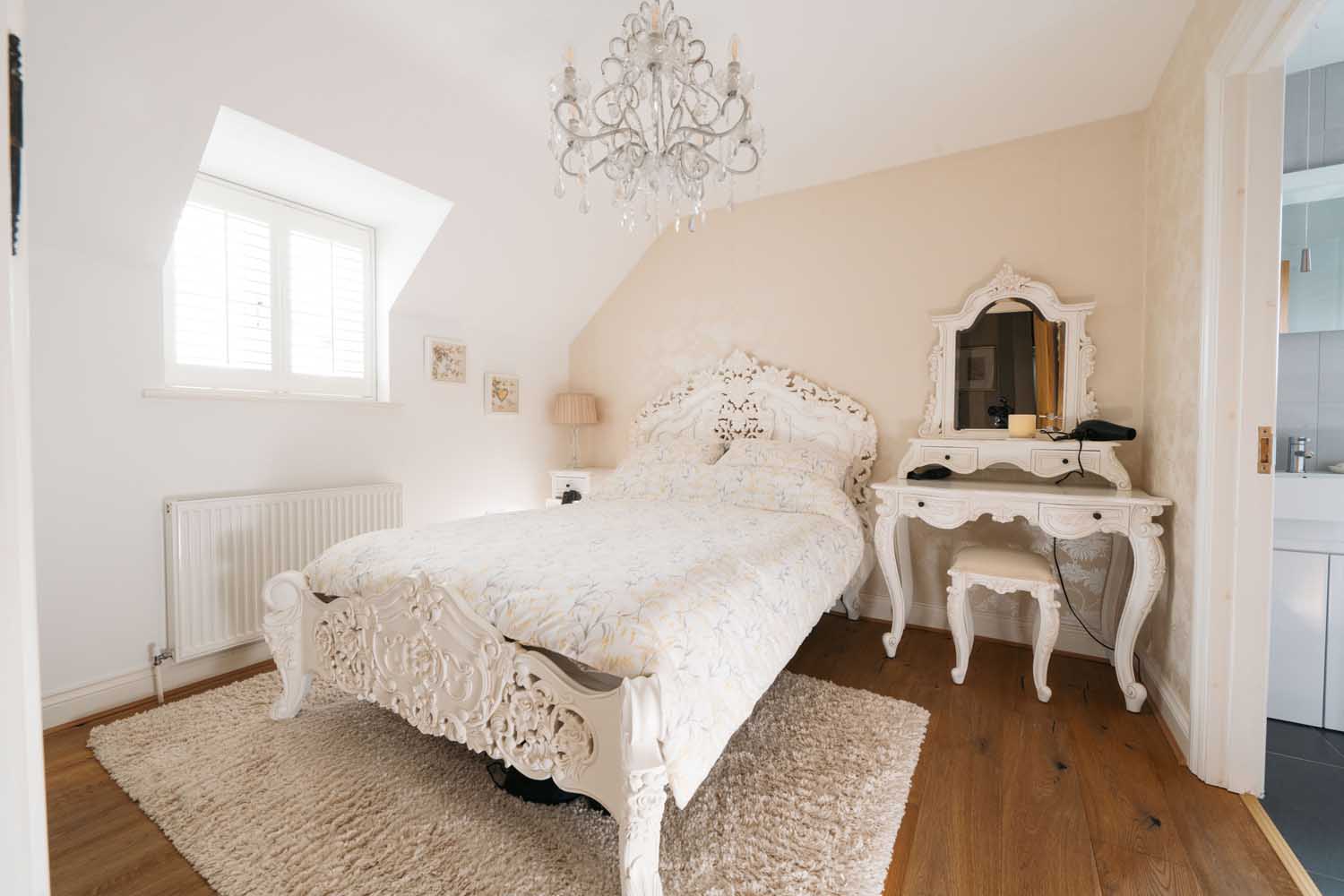 Upstairs, the main bedroom has a generous dressing area, a walk-in dressing room with fitted storage, and an en-suite shower room that has been recently updated. The en-suite includes double sinks, contemporary tiling, and a walk-in shower.
