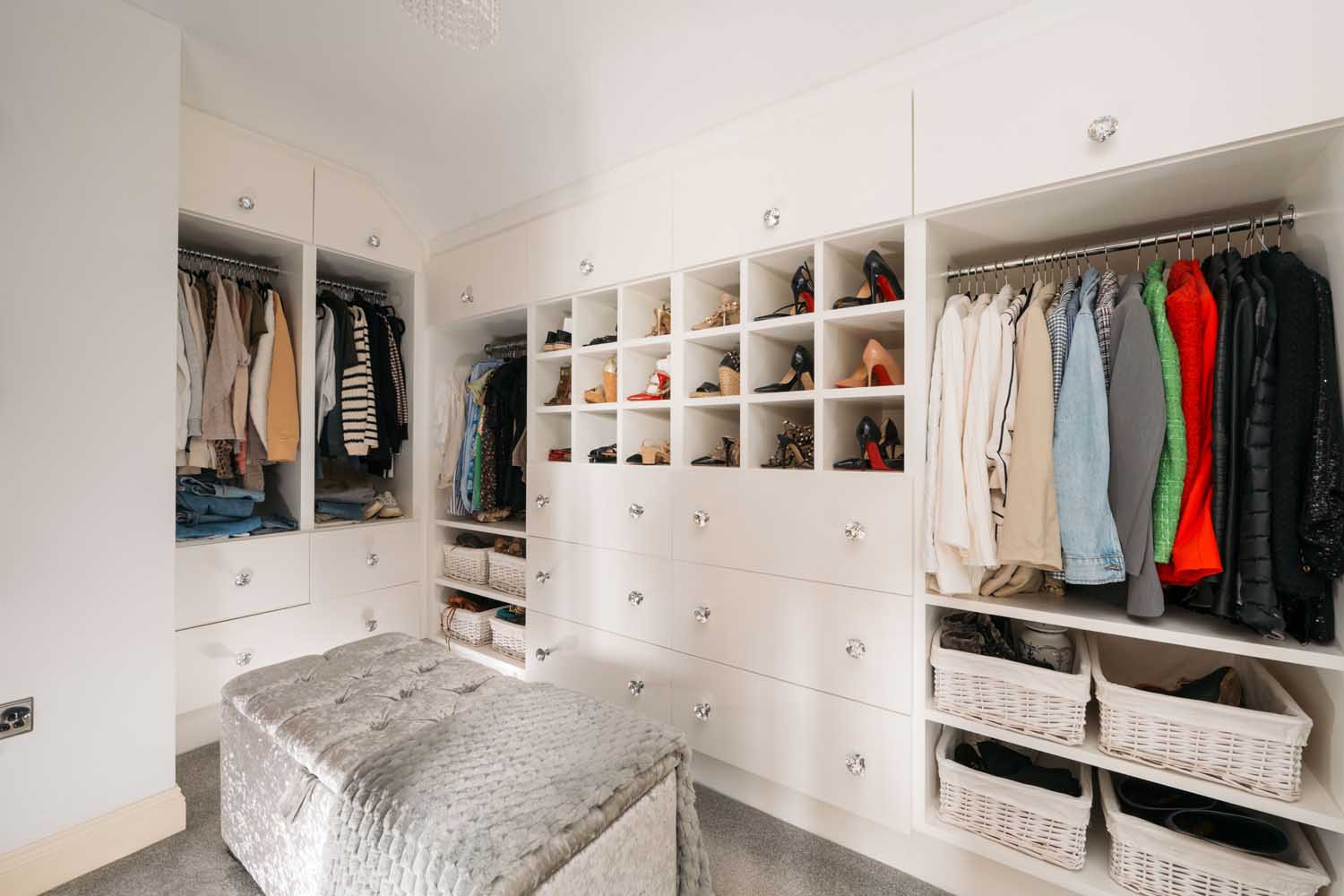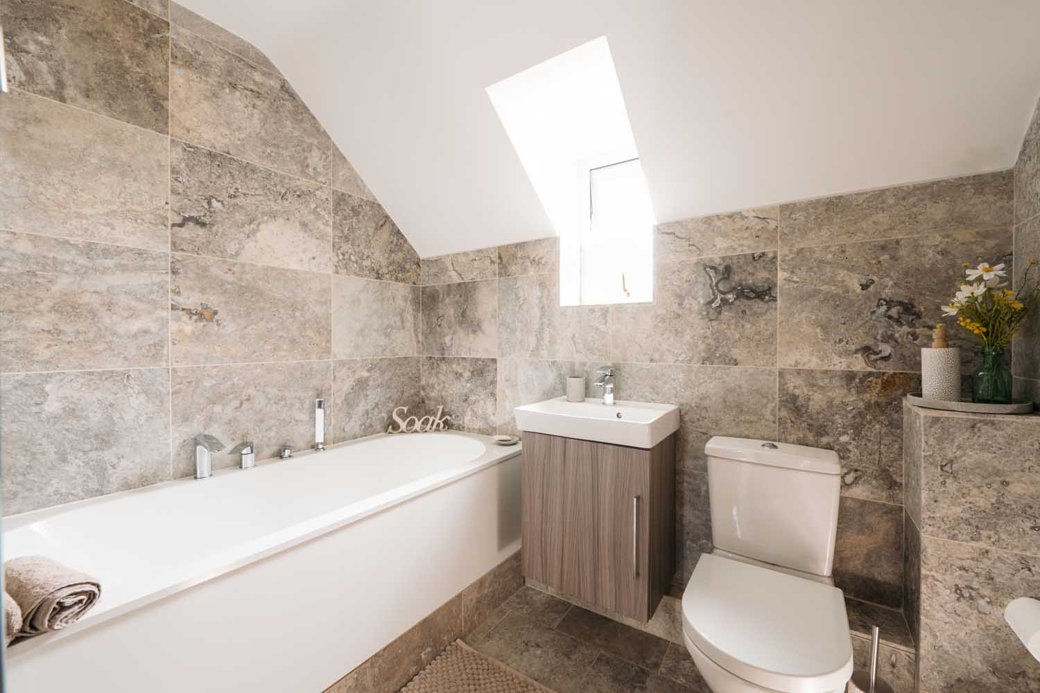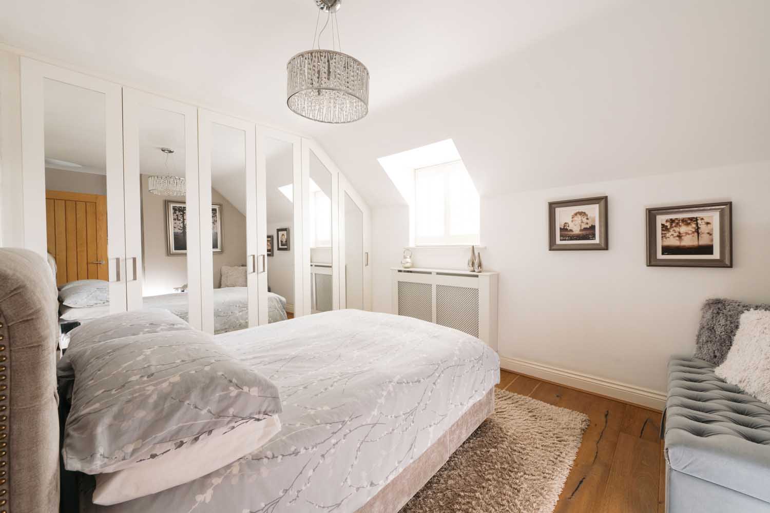 Upstairs, the main bedroom has a generous dressing area, a walk-in dressing room with fitted storage, and an en-suite shower room that has been recently updated. The en-suite includes double sinks, contemporary tiling, and a walk-in shower.