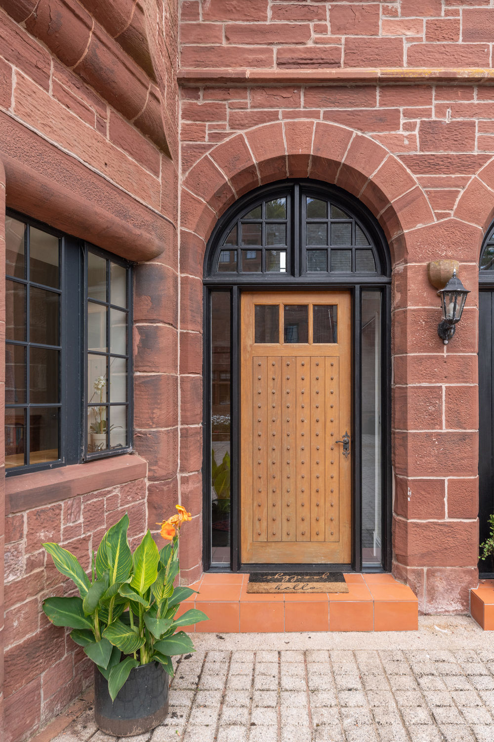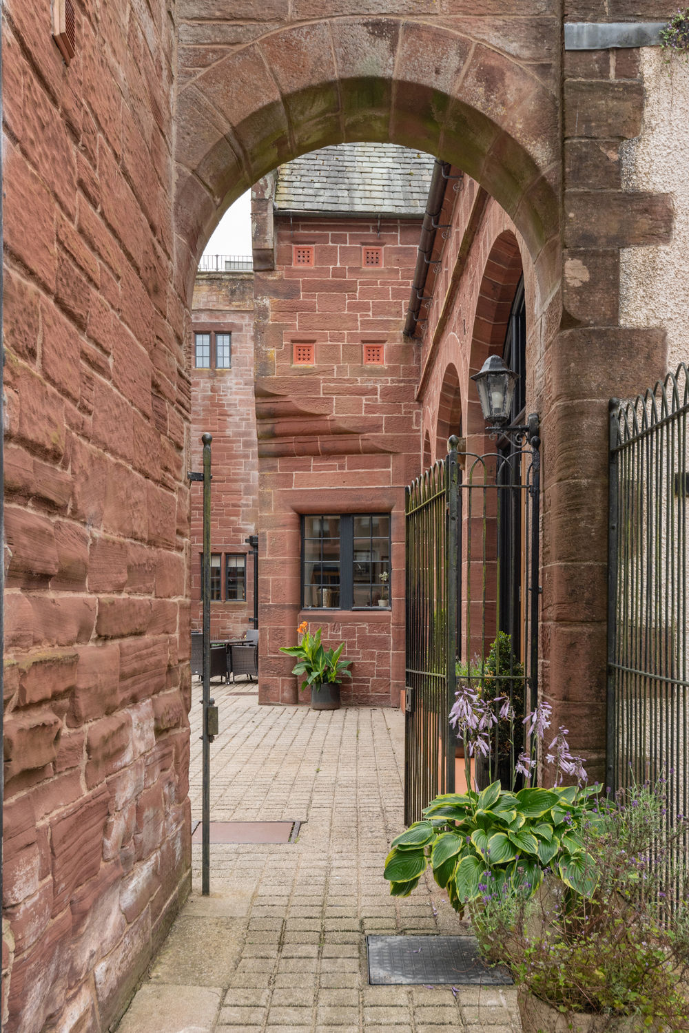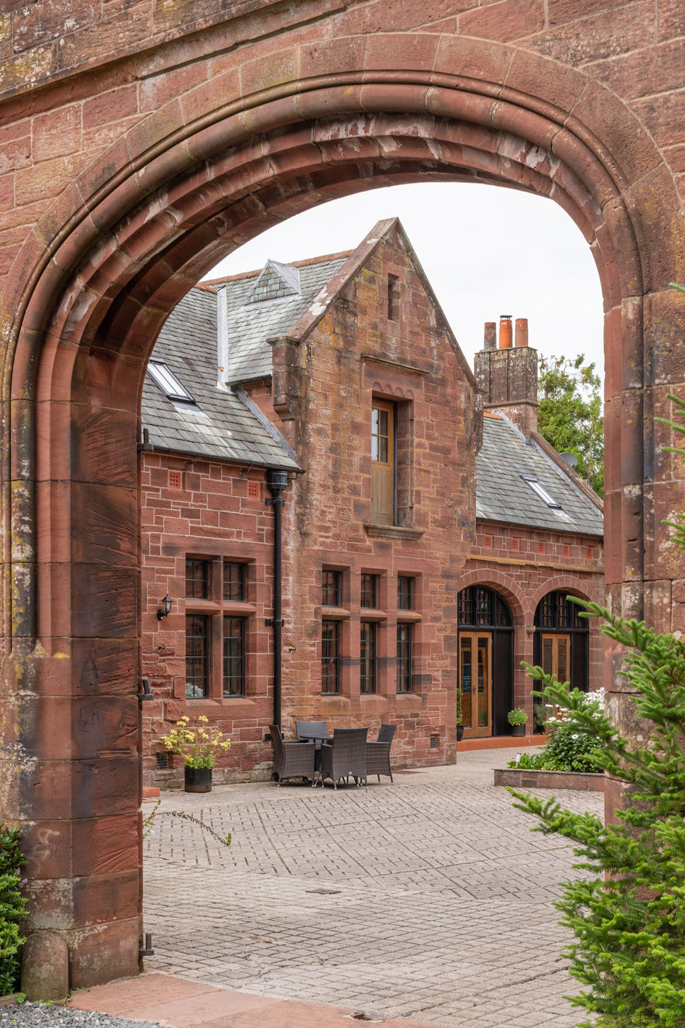 The property is enclosed by historic red sandstone buildings, offering a distinctive, sheltered setting. To the rear, a private lawned garden enclosed by hedging offers afternoon sun and a peaceful space to sit or entertain. A further garden area to the front provides scope for planting, play or additional seating. A secure, double-height outbuilding offers useful storage for bikes, tools and garden equipment. There are four private parking spaces: one at the head of the lane, two to the rear, and one beside the gated entrance to the garden.