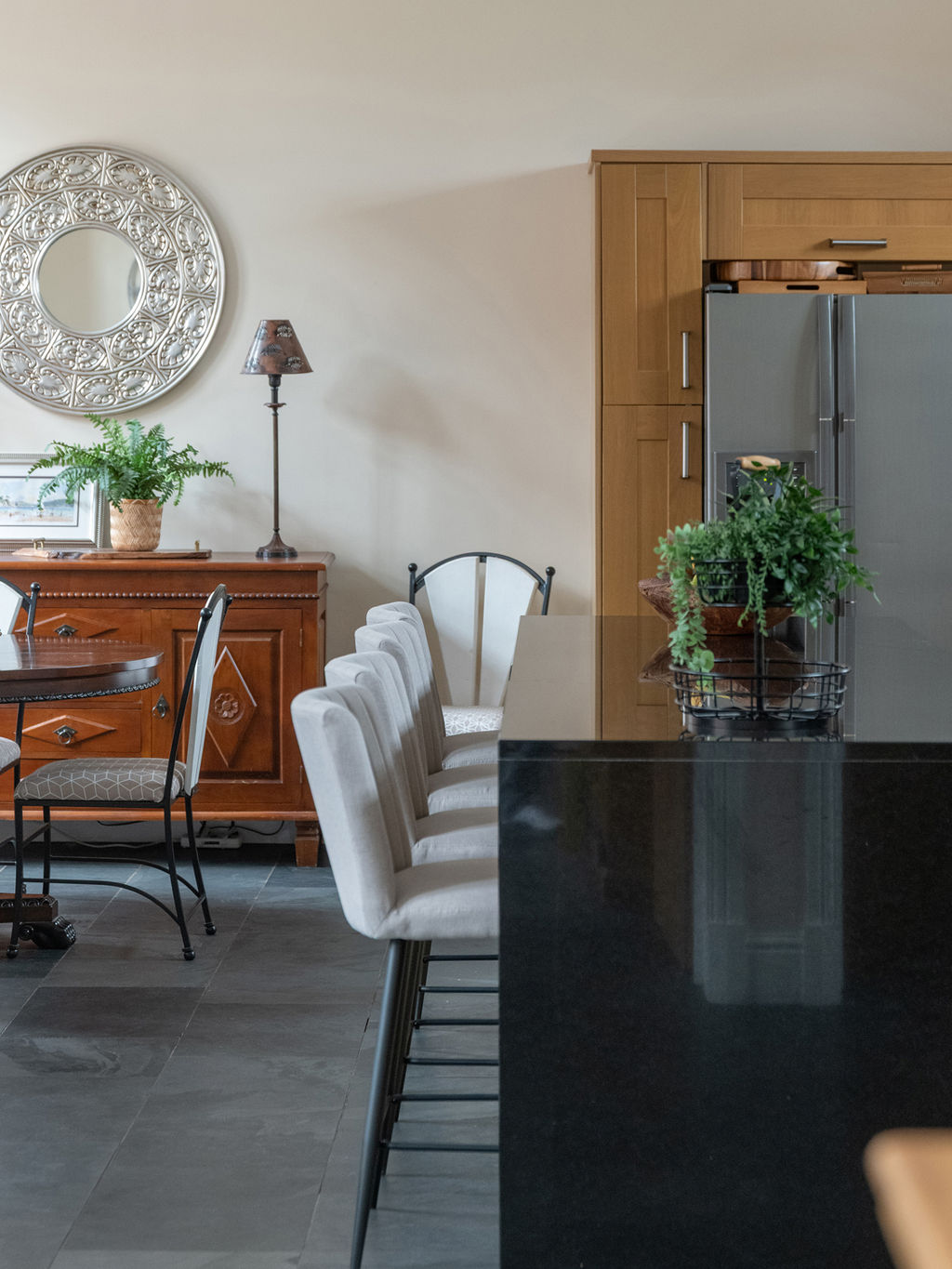 Across the hallway, a second reception room is currently used as a playroom, though equally well suited to a study or snug. A shower room sits adjacent, while to the rear of the property, the open-plan kitchen, dining and living area forms the hub of the home. This expansive space is framed by tall windows set into sandstone surrounds, with views across the courtyard and direct access to the rear garden via a stable-style door. The kitchen is fitted with a broad granite-topped island and matching work surfaces, complemented by premium appliances including a Rangemaster range cooker, a dishwasher and integrated microwave. Full-height cabinetry offers useful storage, while the adjoining utility room provides additional workspace, a second sink, and space for laundry appliances.