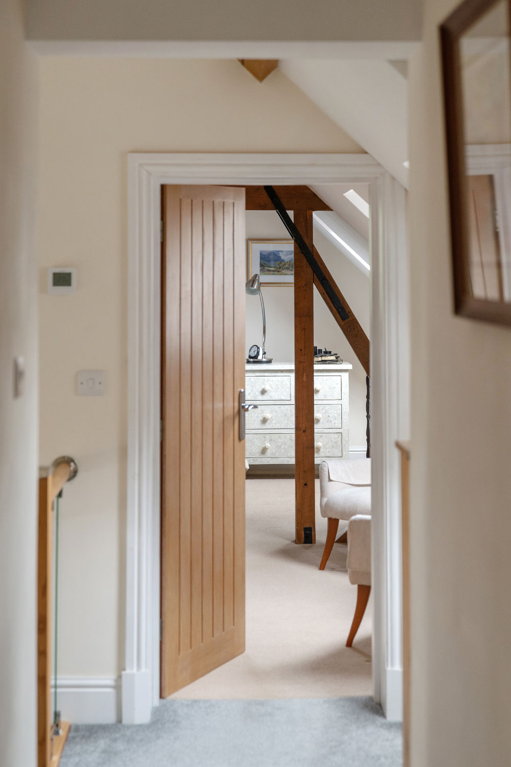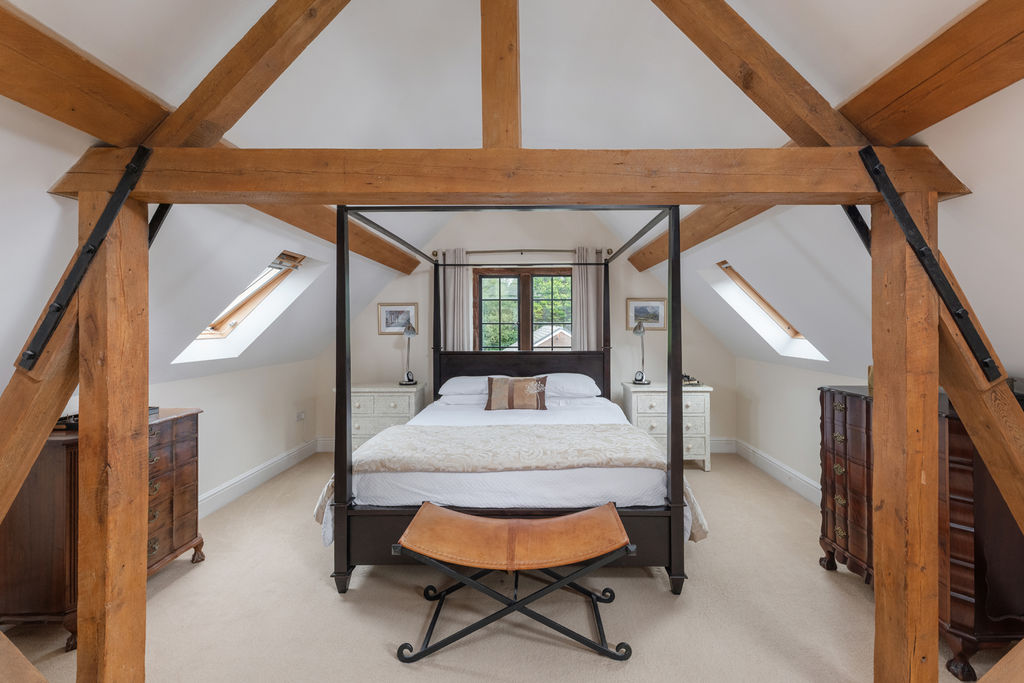 Upstairs, the bedroom accommodation is arranged over two inner landings. The principal bedroom is a generous, vaulted space with exposed beams, three Velux windows and an additional side window that draw in natural light. The en-suite includes a rain shower, vanity unit and stylish slate flooring. A further large bedroom and family bathroom are positioned nearby, the latter including both a panelled bath and walk-in shower.