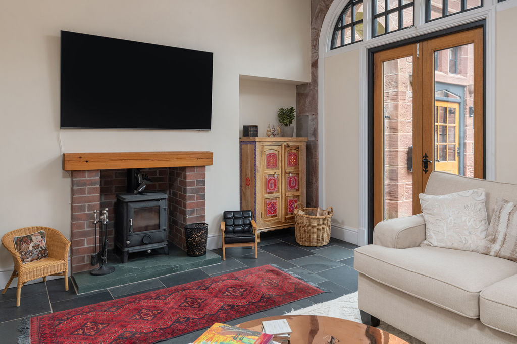 A wide, studded oak door set within a stone arch opens into the entrance hall. To one side lies an elegant sitting room with two sets of French doors framed by original carriage arches, flooding the room with natural light and opening to the courtyard beyond. A wood-burning stove set within a brick surround anchors the space and adds warmth.