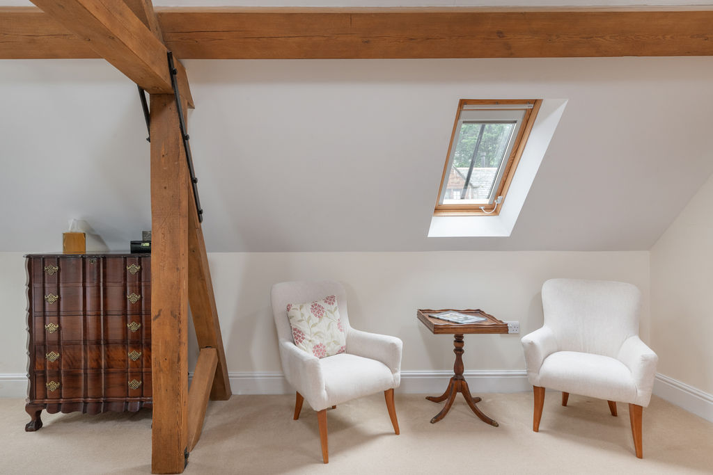 An open-plan study area with eaves storage provides flexibility, while two further bedrooms are positioned at the far end of the house. Both feature vaulted ceilings and exposed beams.