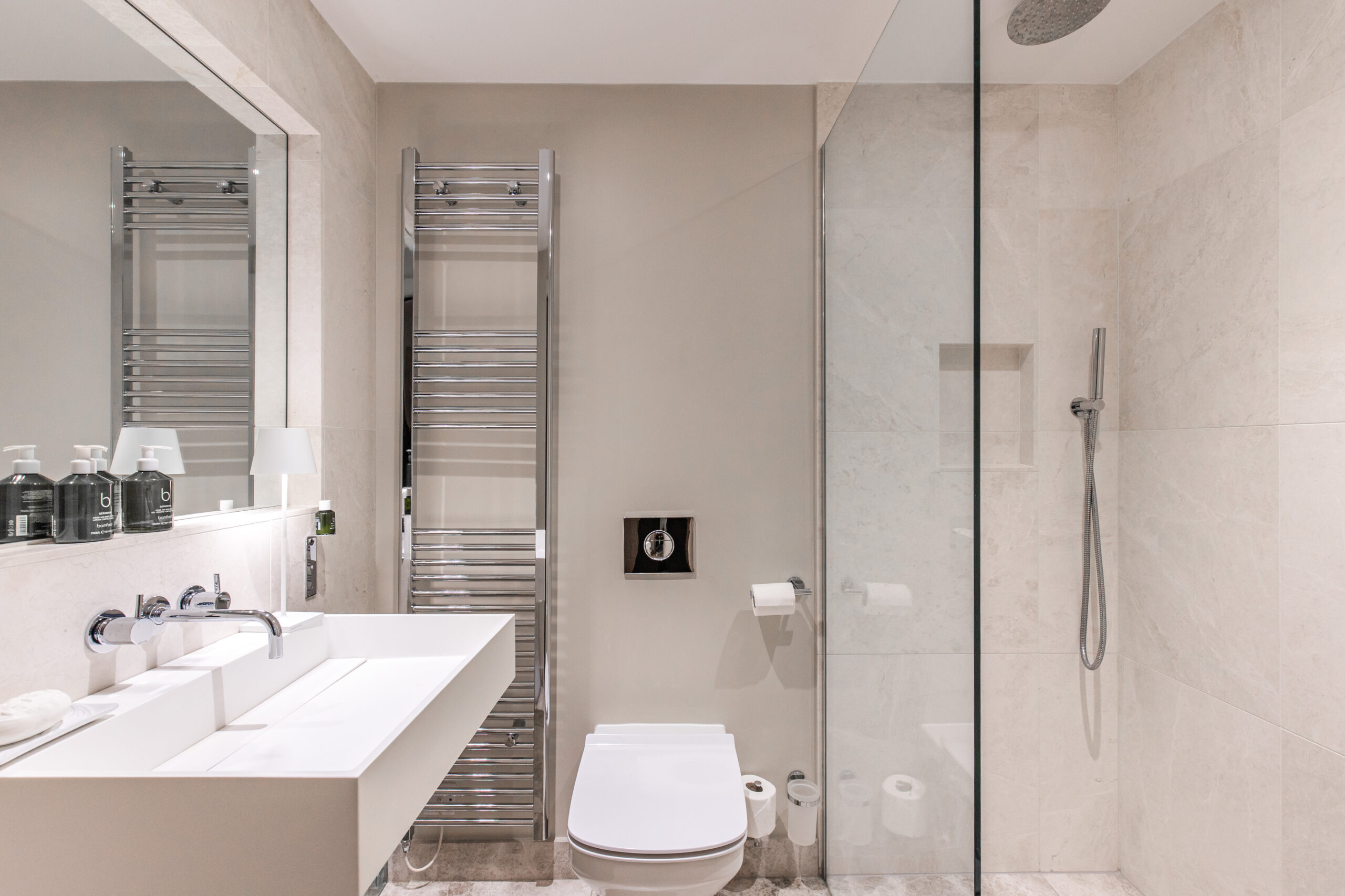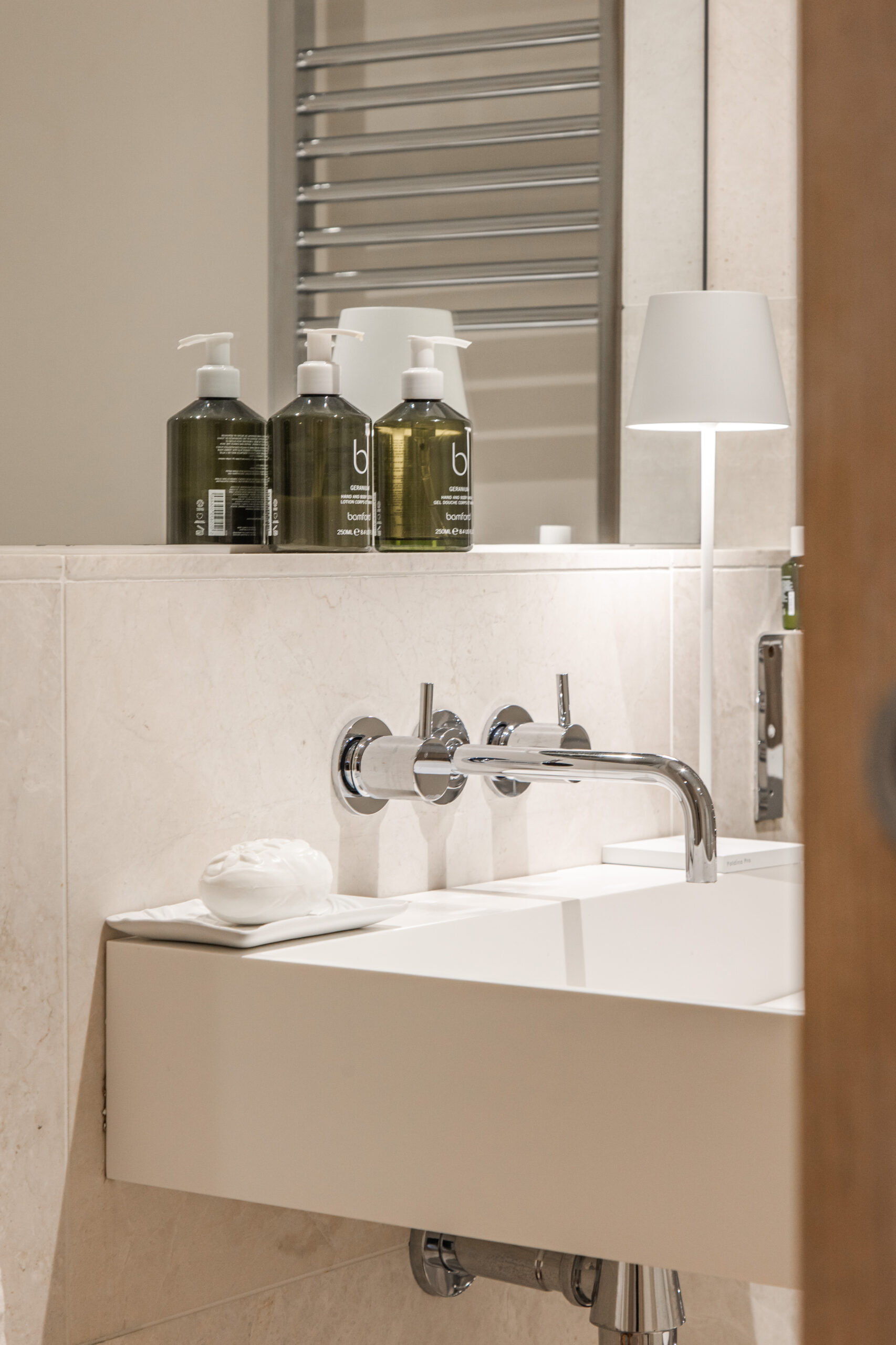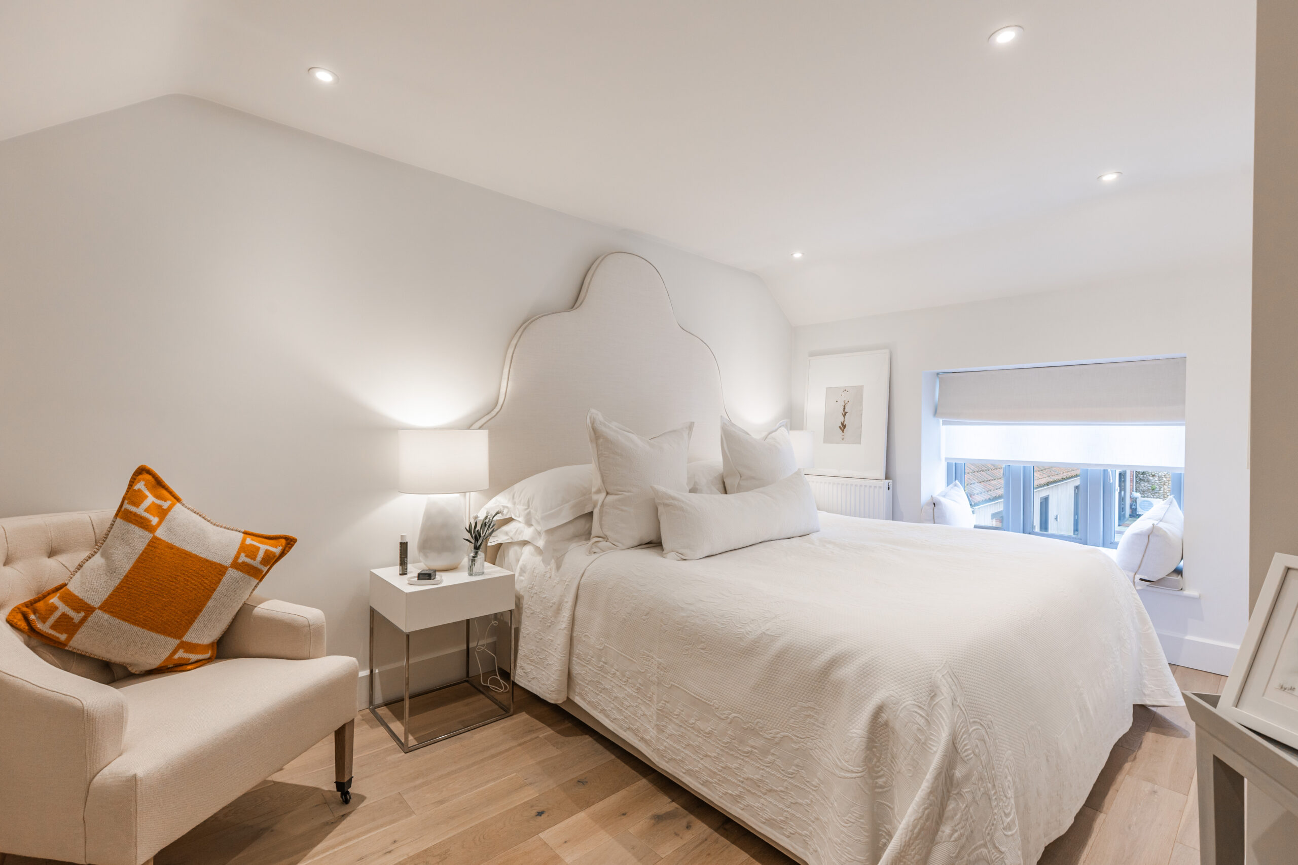 The first floor continues the sense of understated luxury, offering two well proportioned double bedrooms, both featuring fitted wardrobes and charming window seats that enhance comfort and character. The principal bedroom benefits from an extensive range of fitted wardrobes, while the second bedroom offers excellent versatility for guests, family or home working. The first-floor bathroom is beautifully finished, featuring a striking modern stone bath that introduces a sense of quiet indulgence.