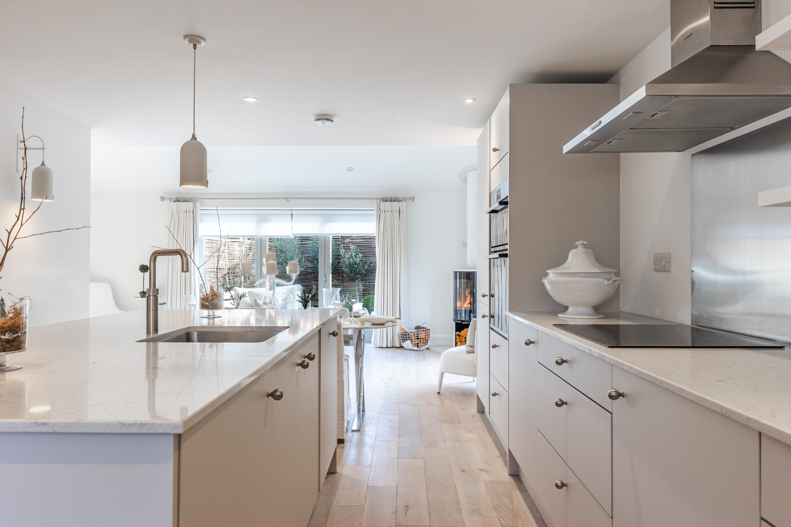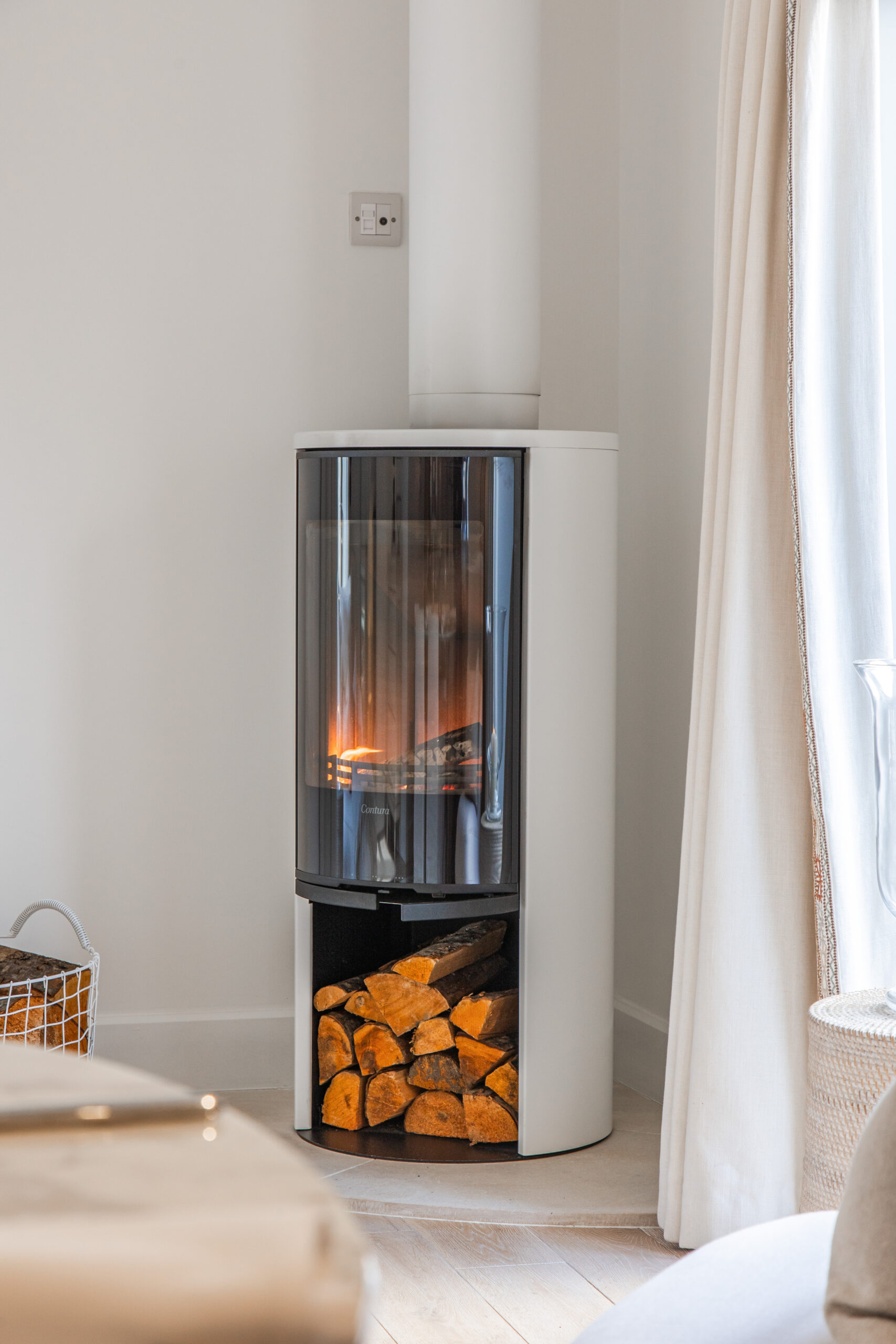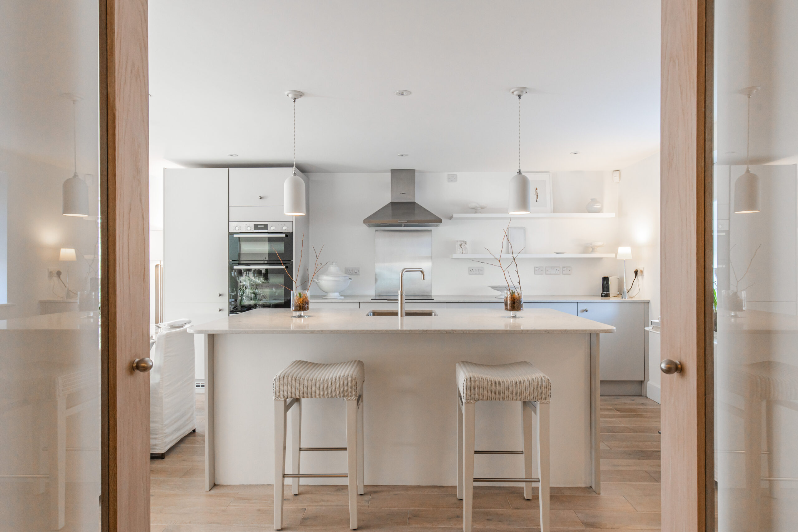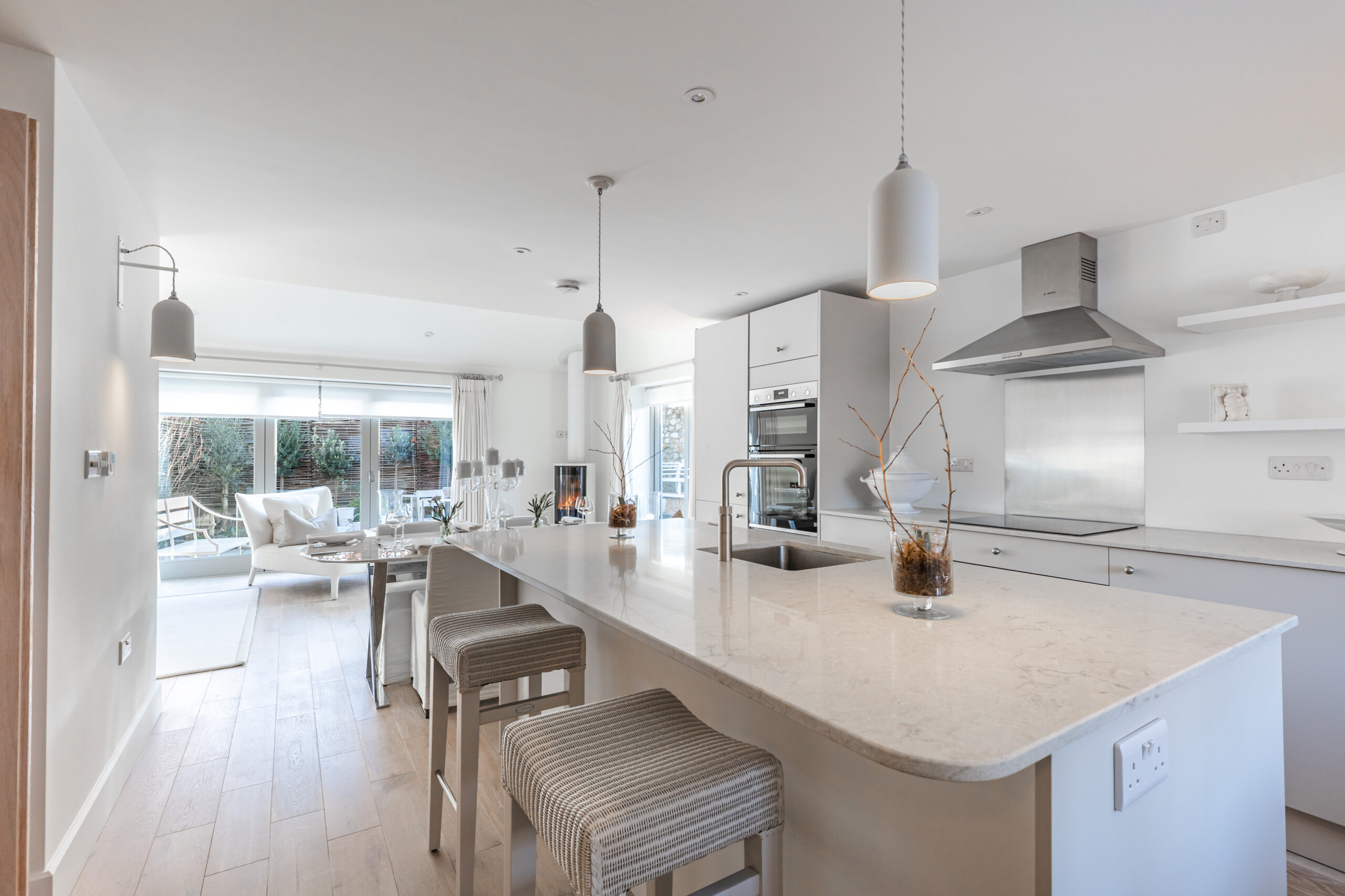 At the heart of the room sits an elegant contemporary kitchen, centred around a substantial island that functions as both a practical workspace and a natural gathering point. Designed with functionality and refinement in mind, the kitchen offers excellent storage and preparation space, equally suited to informal mornings or hosting guests. There is ample room for a dining table, while the sitting area is anchored by a contemporary log-burning stove, providing warmth and a subtle focal point during the cooler months.