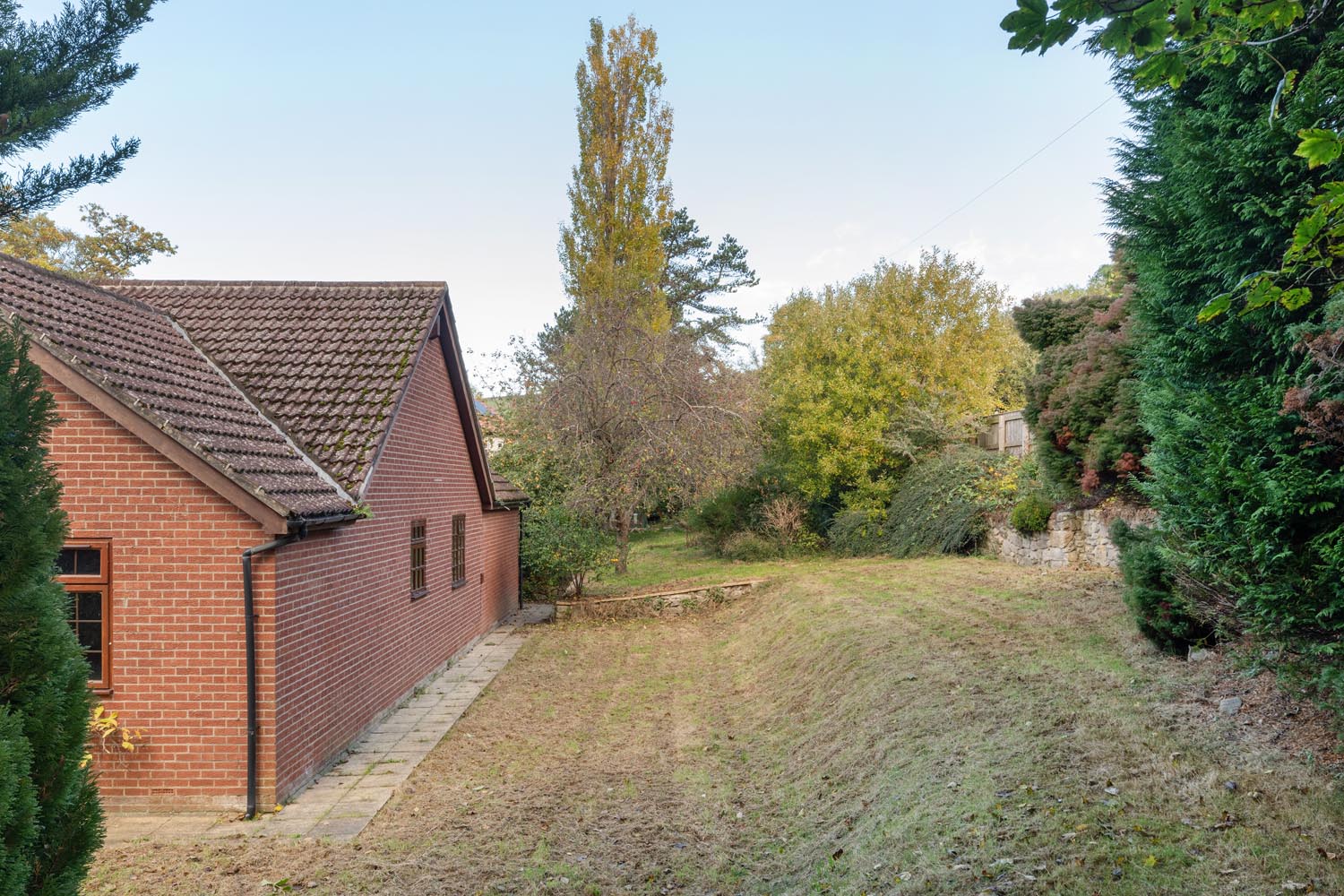 A generous driveway provides ample off-road parking and leads to a detached double garage. The gardens wrap around the house and are set across a series of levels, with a patio terrace by the rear, ideal for outdoor dining and reached directly from the sliding doors of the dining room. Established planting frames the spaces, with useful outbuildings, including a shed and a greenhouse. Security and convenience are supported by an alarm system and a garage mounted security light.