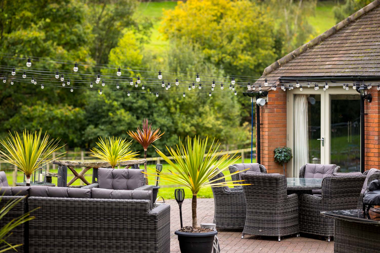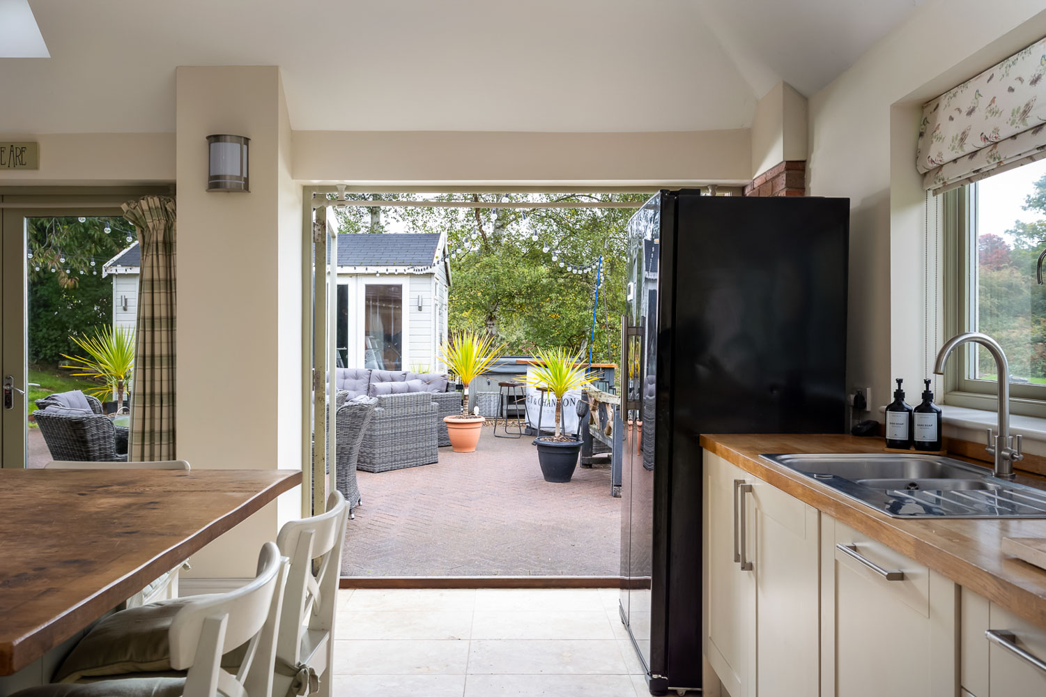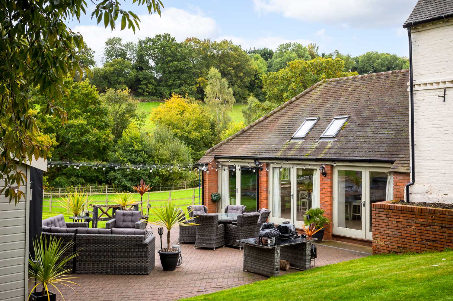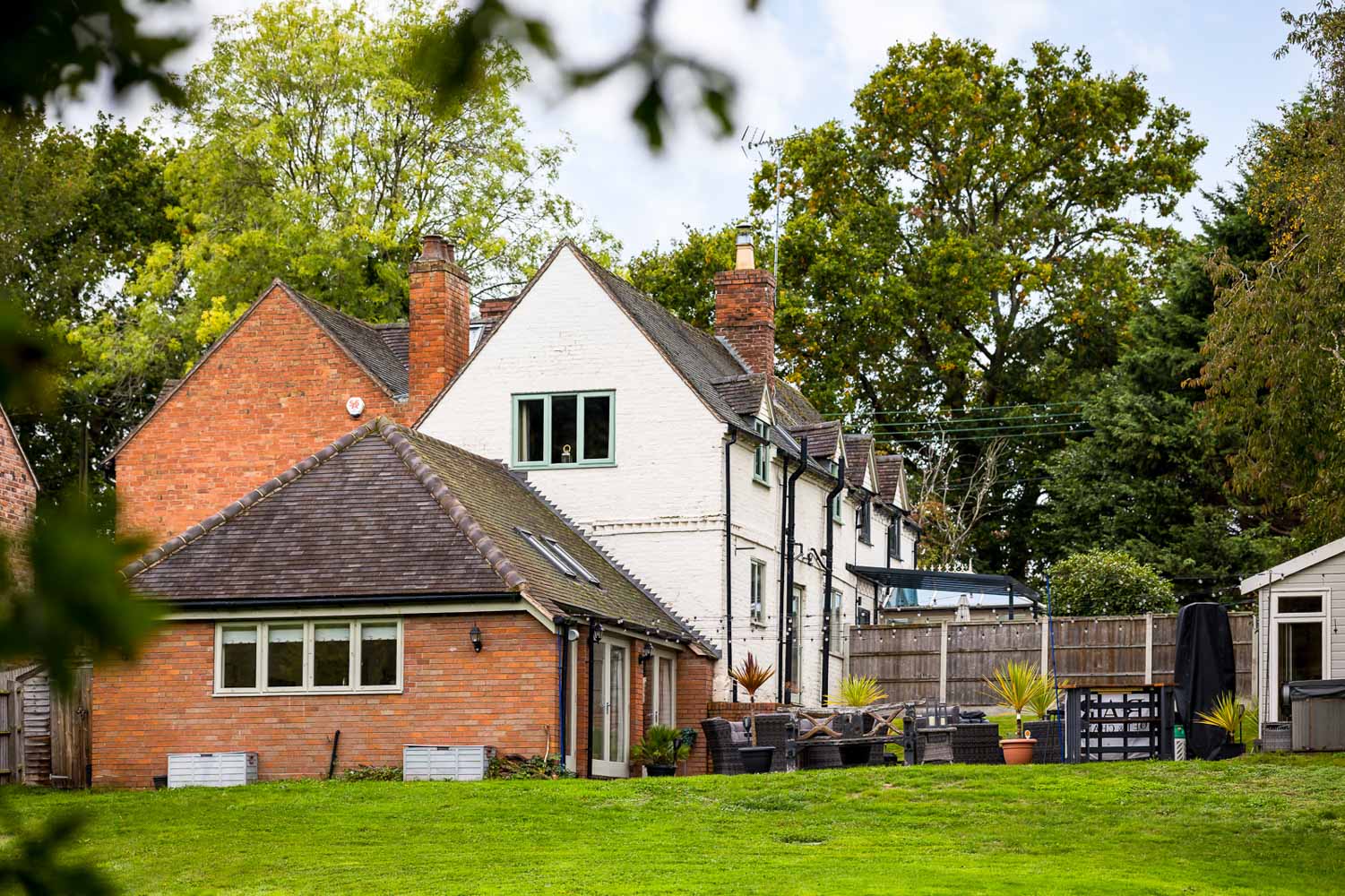 Outside, a large lawn area – lots of space for play and pets. A brook flows at the end of the garden lined with bushy trees providing a serene backdrop.