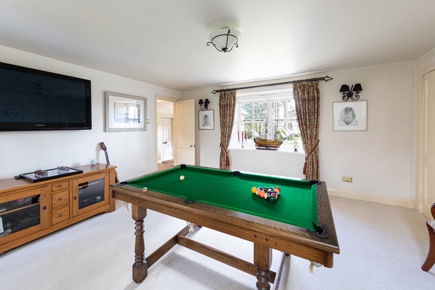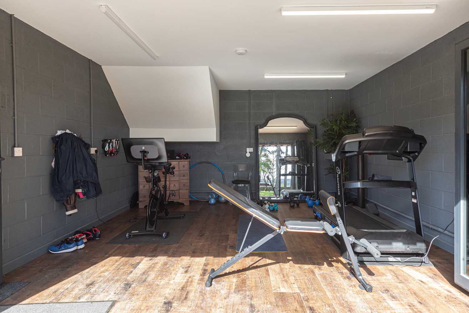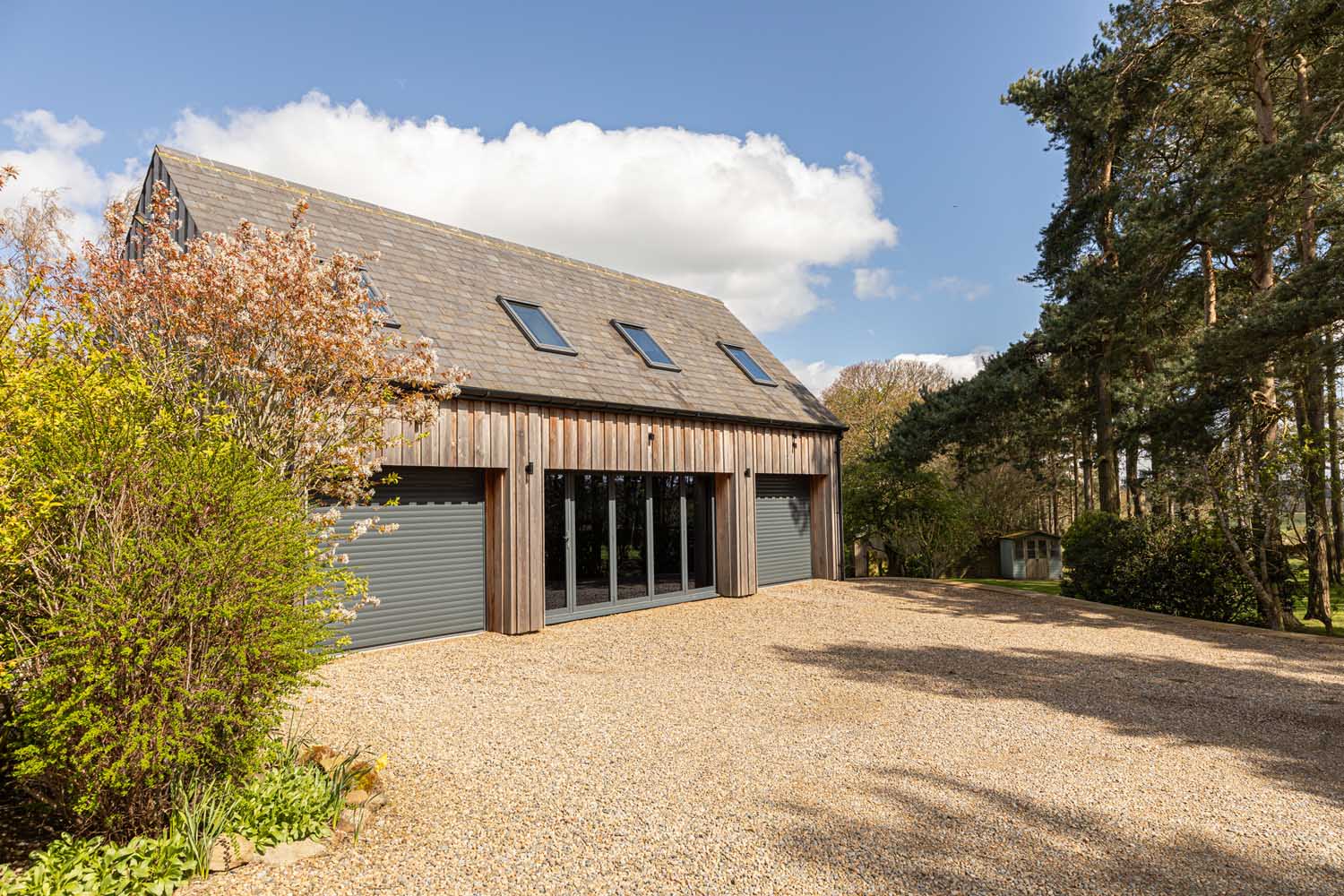 The architecturally designed, cedar-clad garage and gym are located away from the house and consist of a double garage and gym on the ground floor, with accomodation on the first floor. Entrance to the central gym area is through a glazed door, adjacent to large bi-fold doors that open to a south-facing aspect. The external garage doors are electrically operated.