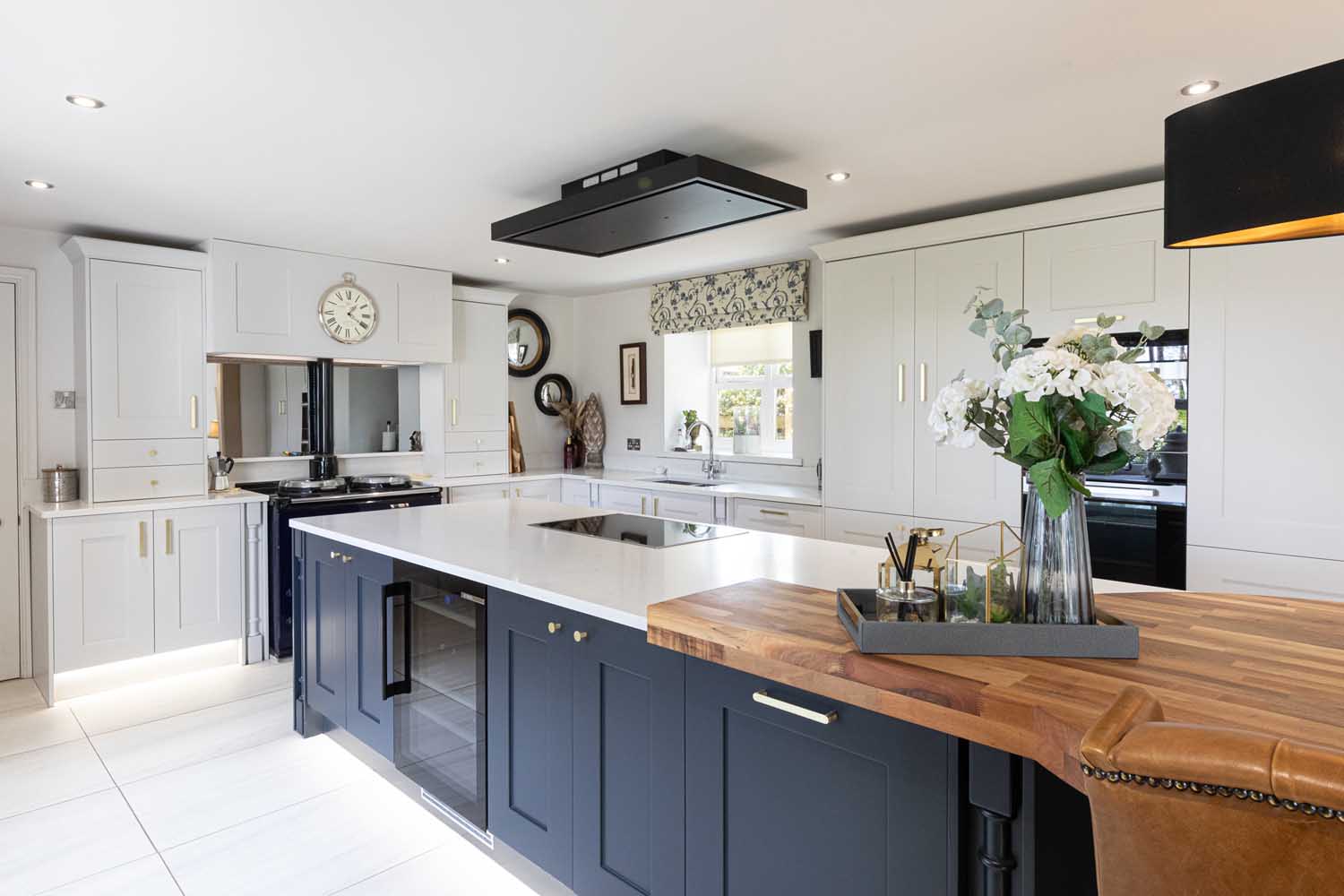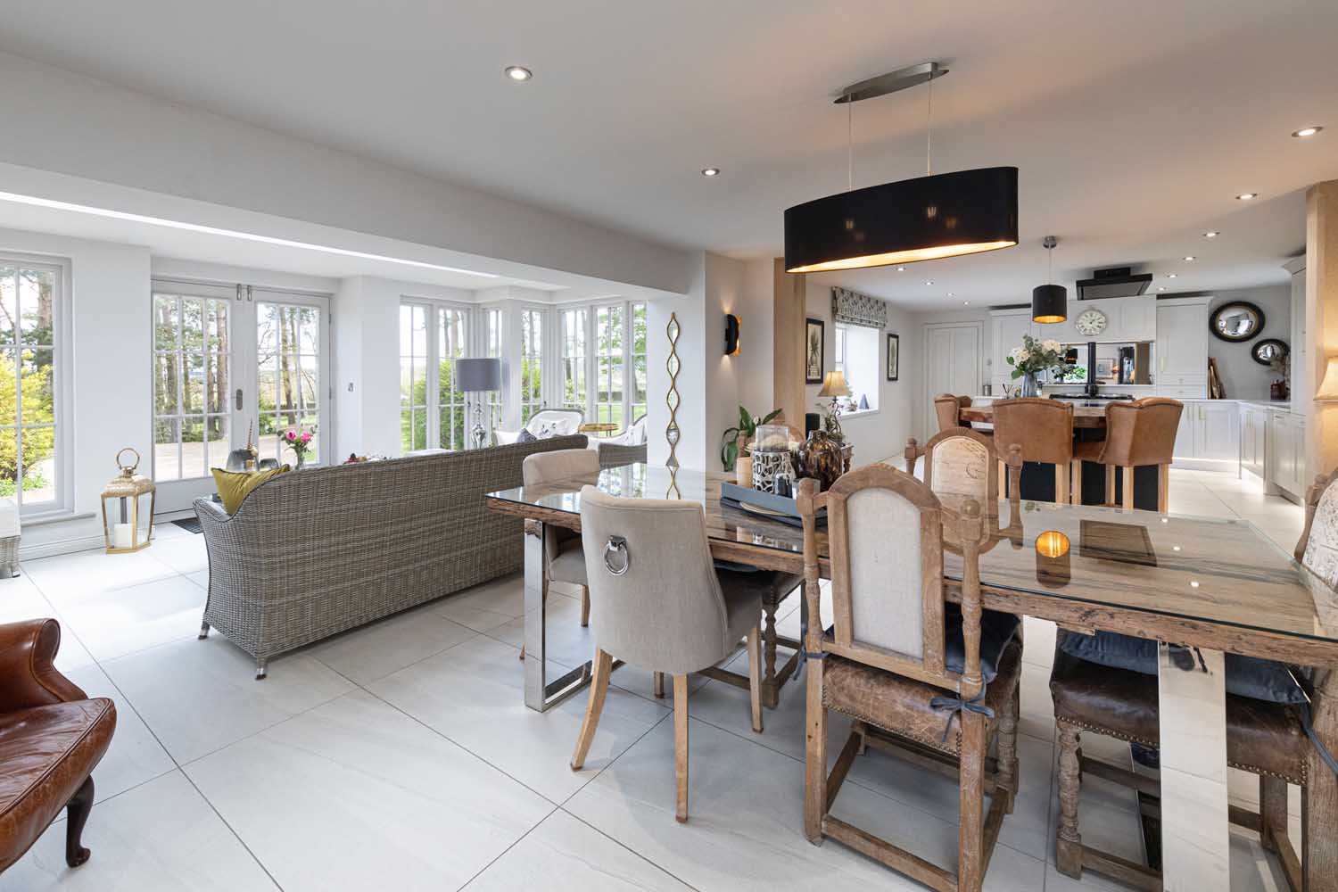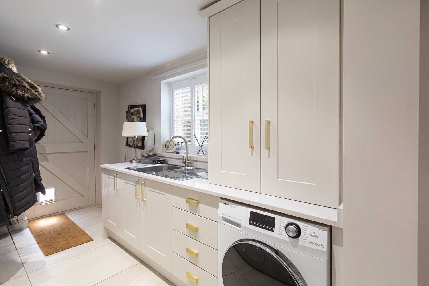 The stunning kitchen features a range of hand-painted bespoke units and marble worktops, with integrated appliances including a full-size fridge, full-size freezer, Miele microwave, Miele electric oven, dishwasher, and dual-zone wine cooler. A gas Aga is neatly positioned between the bespoke cabinetry. Set in the large kitchen island is a Miele induction hob with an extractor over, and the island extends to a beautiful wood breakfast bar with storage underneath. The kitchen flows seamlessly into the dining area and further into the Orangery, with a continuation of palettes and flooring, underfloor heating, and ample natural light from the Orangery lantern. The wraparound Orangery windows include French doors leading out towards the terraces and the outdoor kitchen area. The utility/boot room, located off the kitchen, offers additional cabinetry, integrated fridge and freezer spaces, and areas for a washing machine and tumble dryer.
