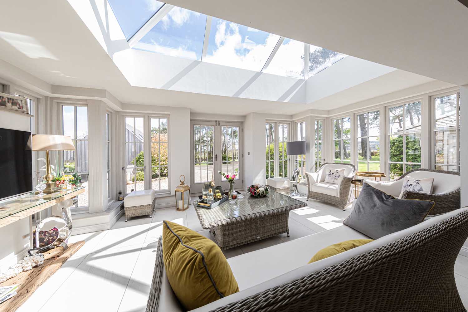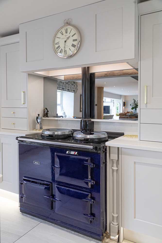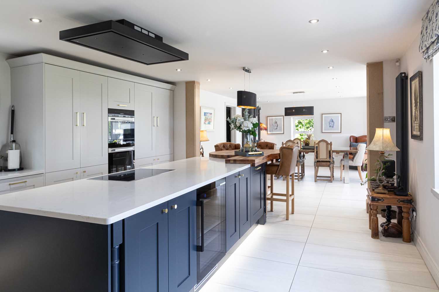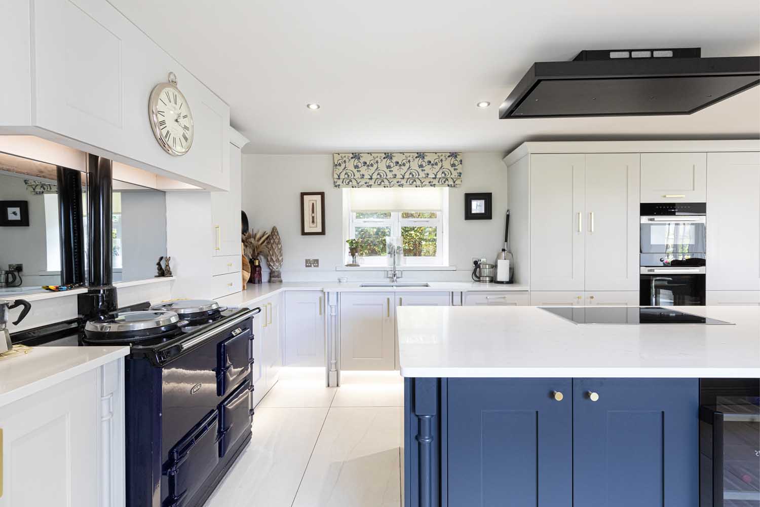 The stunning kitchen features a range of hand-painted bespoke units and marble worktops, with integrated appliances including a full-size fridge, full-size freezer, Miele microwave, Miele electric oven, dishwasher, and dual-zone wine cooler. A gas Aga is neatly positioned between the bespoke cabinetry. Set in the large kitchen island is a Miele induction hob with an extractor over, and the island extends to a beautiful wood breakfast bar with storage underneath. The kitchen flows seamlessly into the dining area and further into the Orangery, with a continuation of palettes and flooring, underfloor heating, and ample natural light from the Orangery lantern. The wraparound Orangery windows include French doors leading out towards the terraces and the outdoor kitchen area. The utility/boot room, located off the kitchen, offers additional cabinetry, integrated fridge and freezer spaces, and areas for a washing machine and tumble dryer.