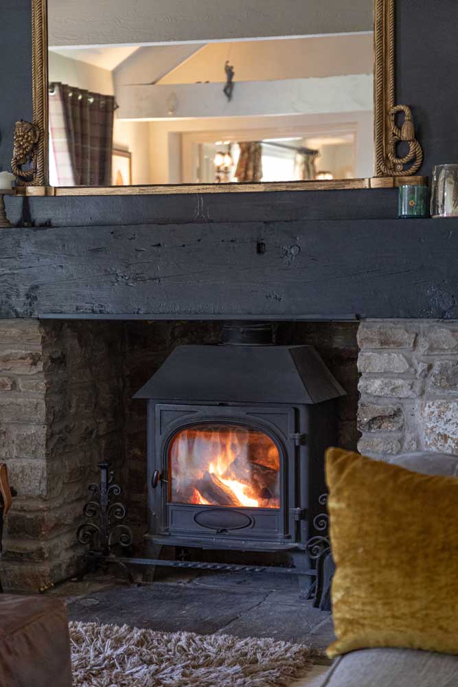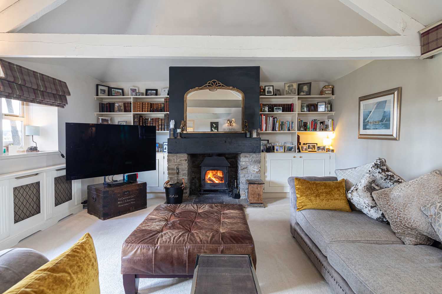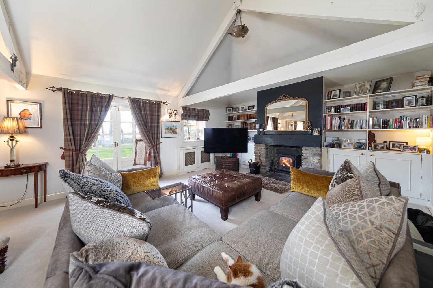 A solid wood door leads into the spacious, split-level entrance hall with flagstone flooring on the lower level. Steps lead up to the main house, which features wooden flooring and stairs to the first floor. The principal reception rooms are located to one side with a spacious dining room leading from the entrance hall, featuring dual aspects to the front and rear. The drawing room, with its vaulted ceiling, adds to the character of the room, and a deep chimney breast recess houses a multi-fuel stove at one end. French doors lead out to a paved patio area, providing a glorious outlook over the gardens.