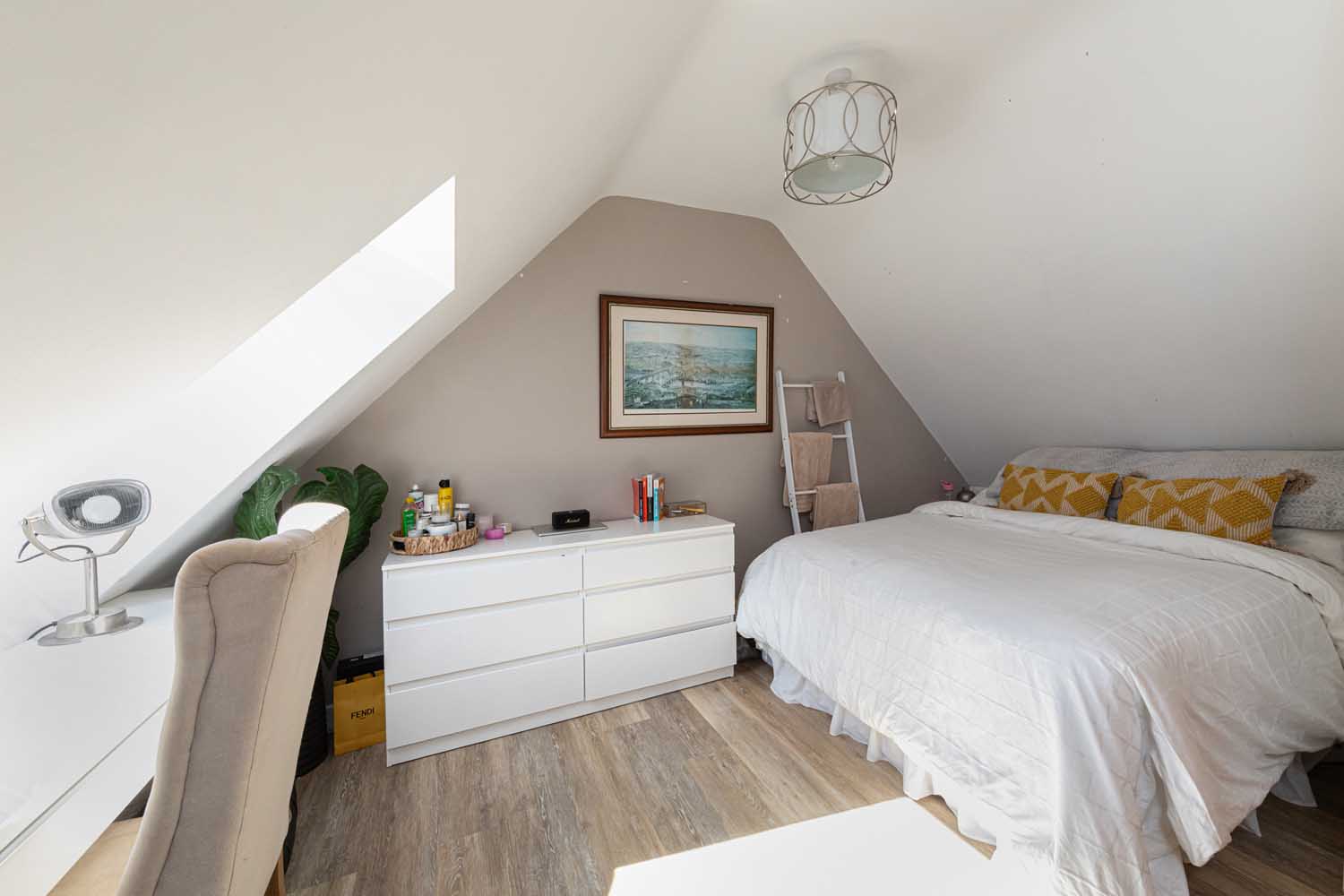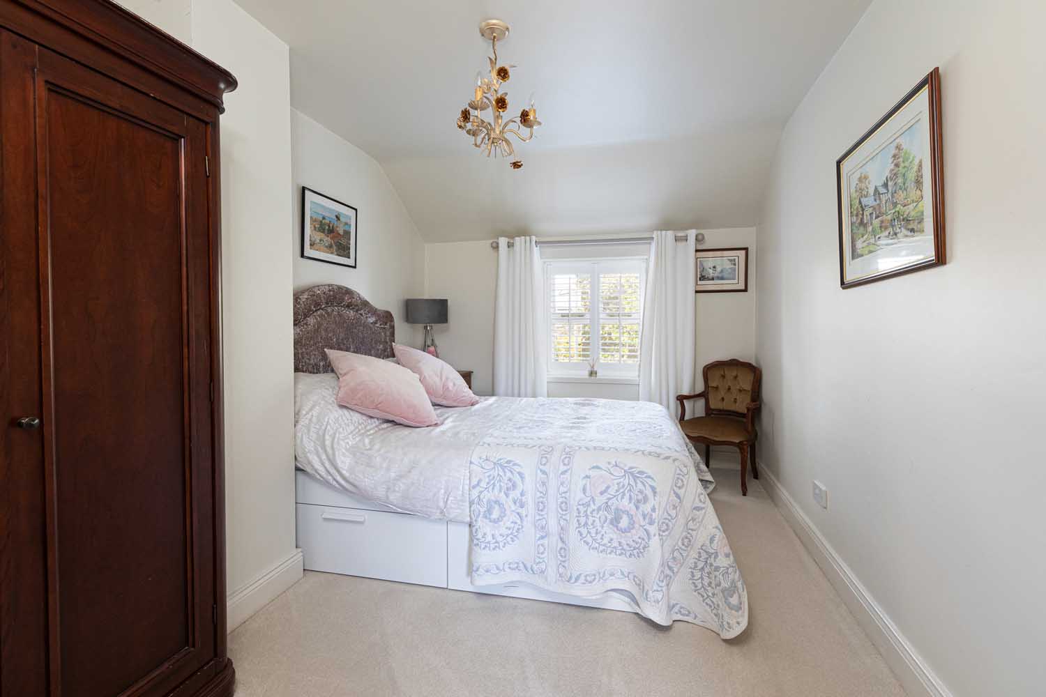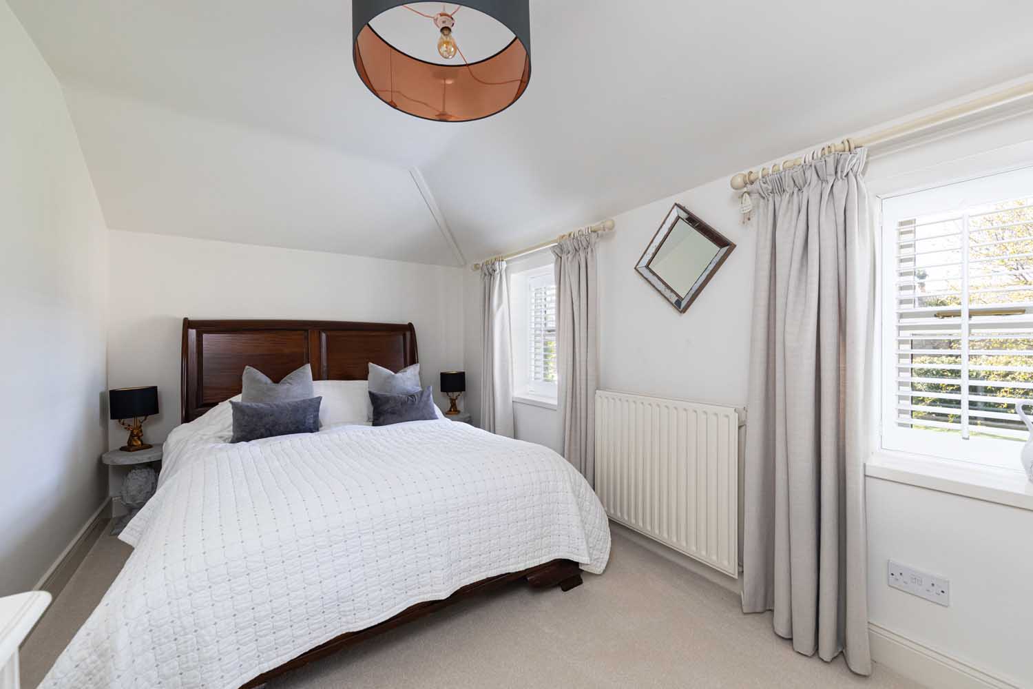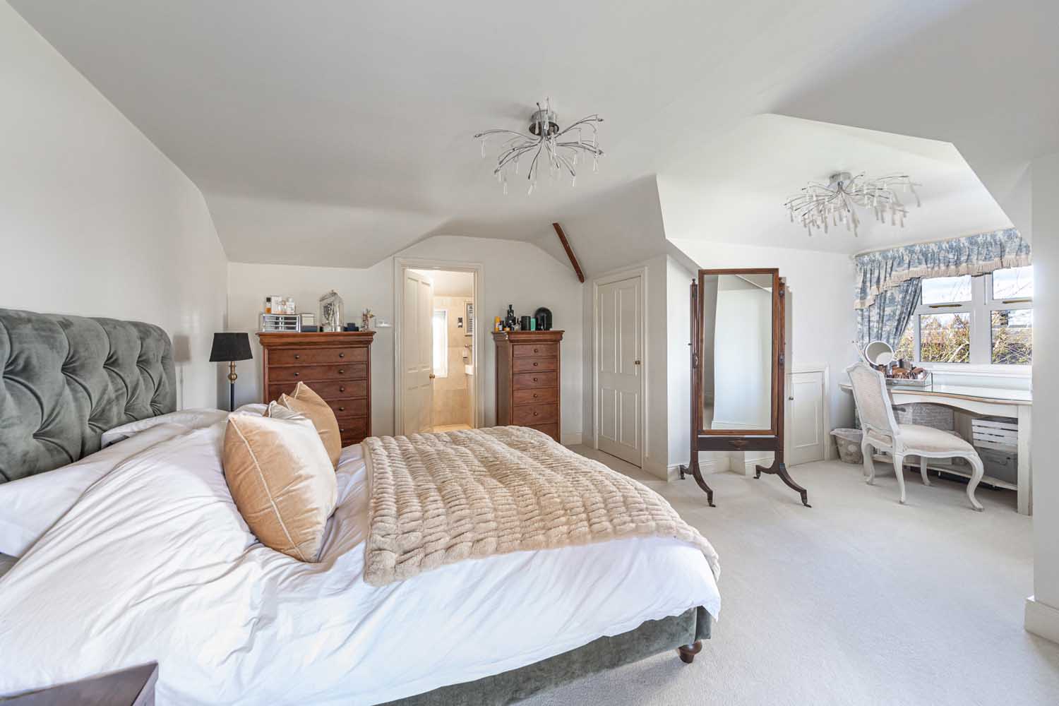 Stairs lead to the first floor landing with access to all bedroom accommodations. The master bedroom, generously proportioned, includes two built-in cupboards and additional storage in the eaves. A dormer window floods the room with natural light, while another window offers views over the garden and beyond. The master bedroom also benefits from a recently refurbished en-suite shower room.