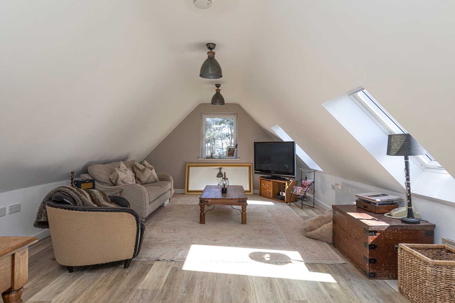 The upstairs accommodation consists of a large, contemporary space with dual aspects through an east-facing picture window and several south-facing Velux windows. There is a door to a bedroom with a south-facing Velux window and a compact en-suite shower. The building is heated by electric radiators and has broadband connectivity.