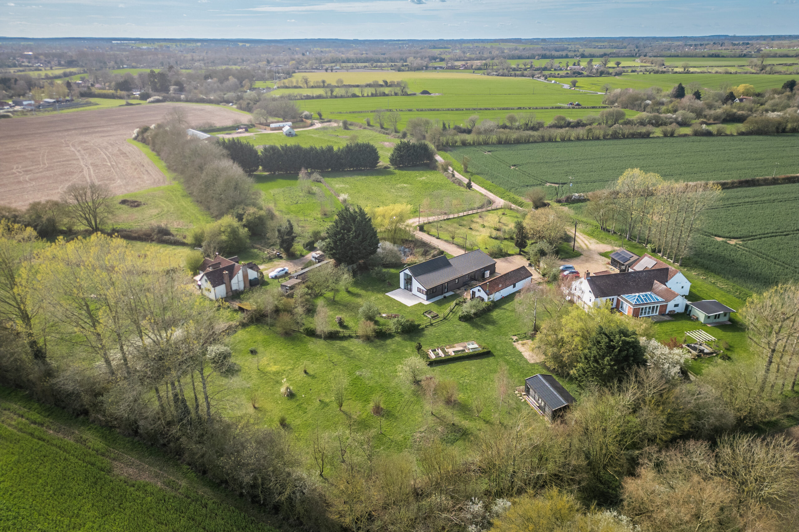 The grassland or paddock areas on the west and east sides of the property provide additional versatility, suitable for equestrian use or simply enjoying the open space.