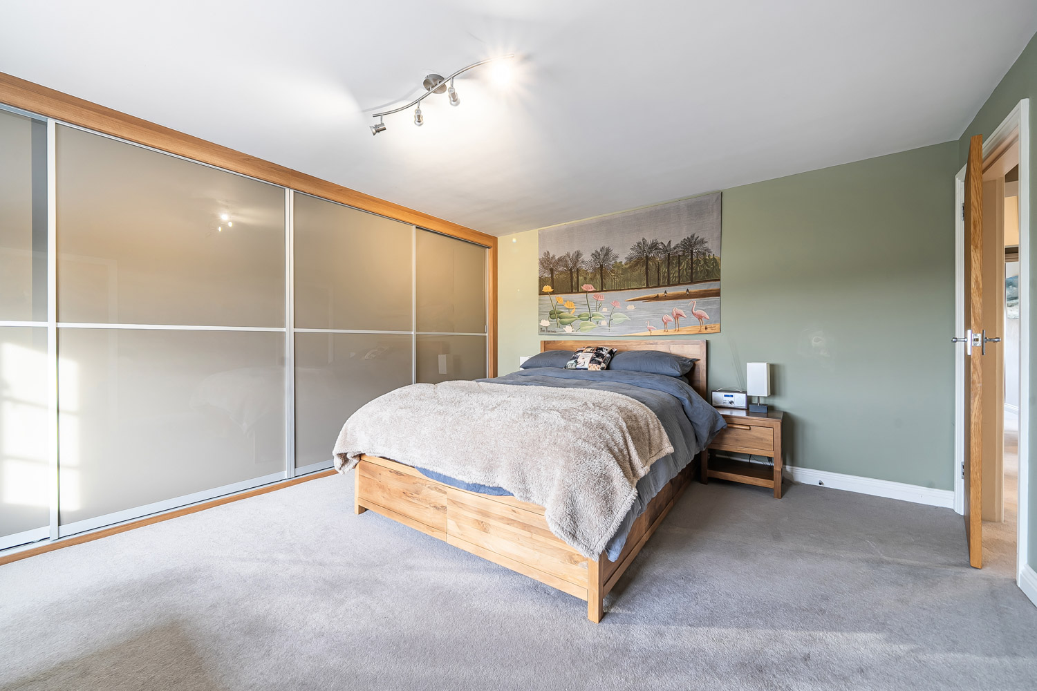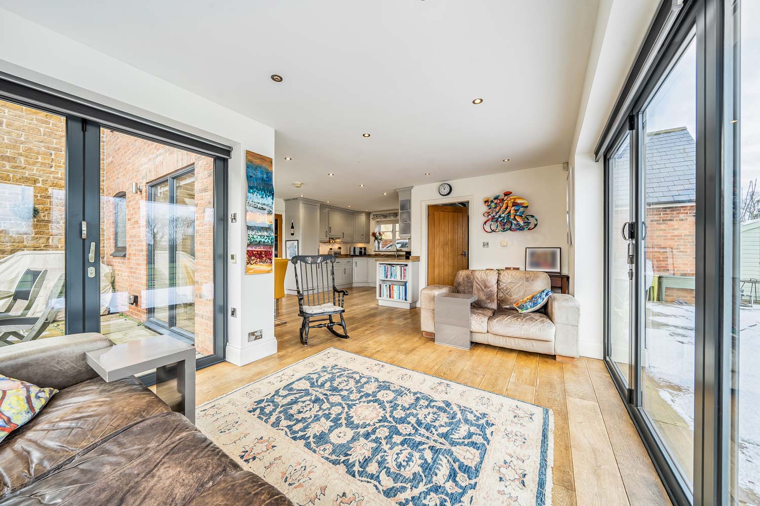 The kitchen with dining area features a full glazed rear corner giving a sunroom feel, looking out over a low maintenance garden with estate and steel weave fencing and far-reaching views. The master bedroom benefits from a walk-in dressing room, with two further bedrooms plus a third bedroom with en-suite, and a family bathroom. Garaging included.