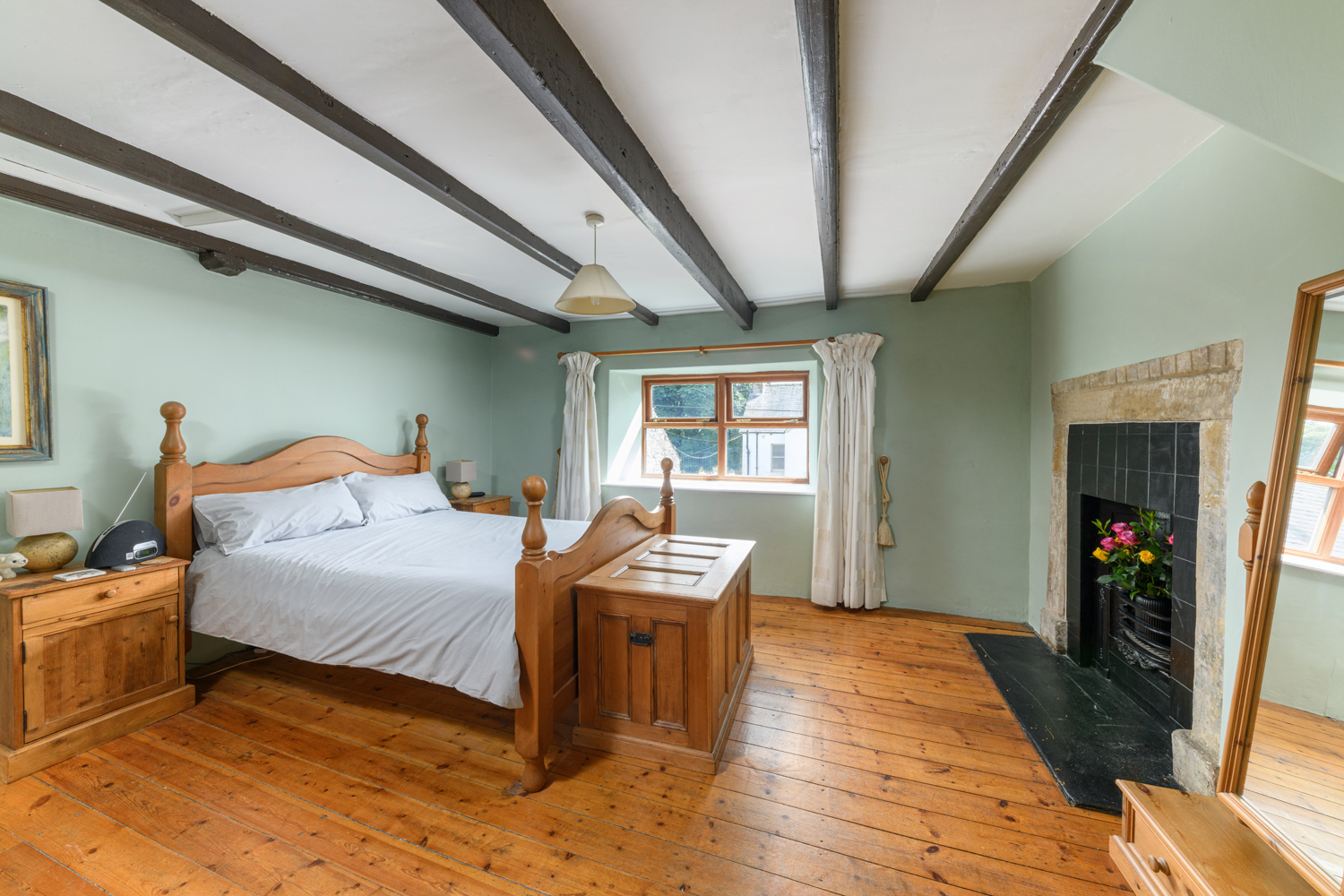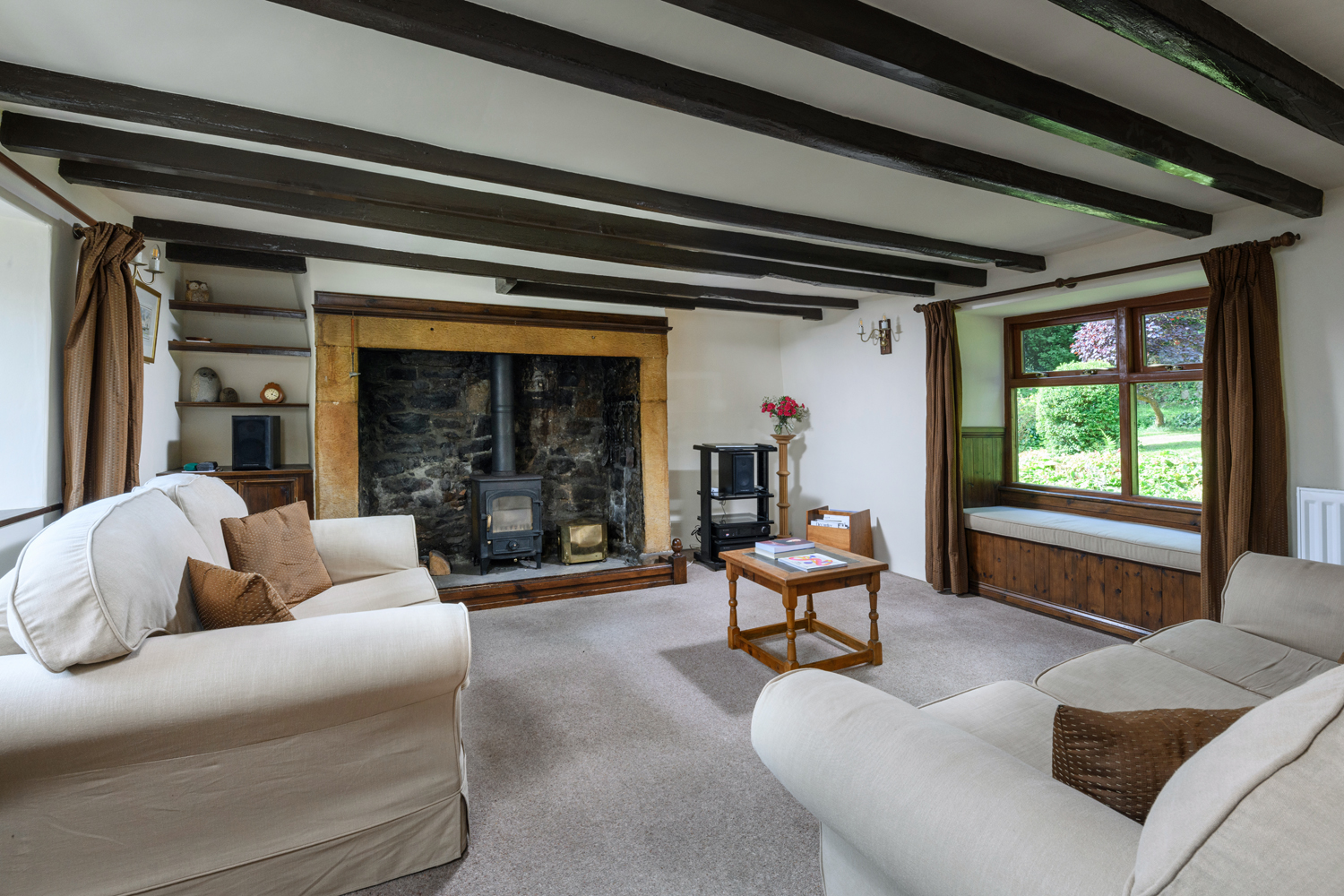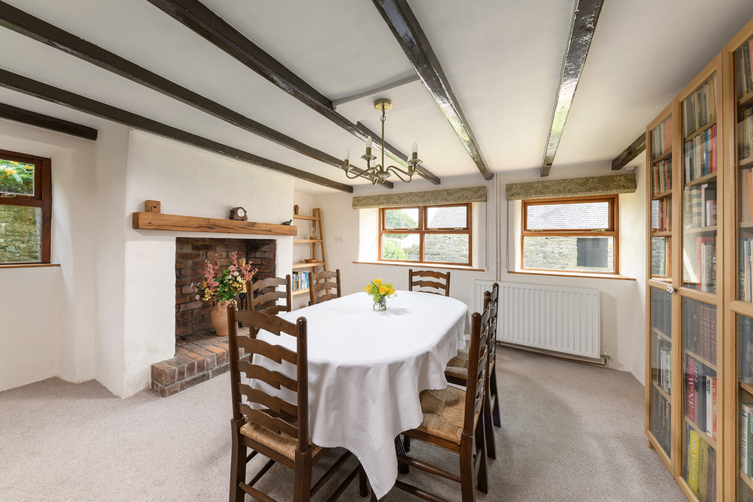 A sitting room and a separate dining room complete the ground floor. The sitting room’s obvious focal point is an impressive inglenook fireplace that houses a Clearview multifuel stove. A recessed window with a window seat provides a lovely outlook across the rear garden, and exposed beams impart a traditional feel.