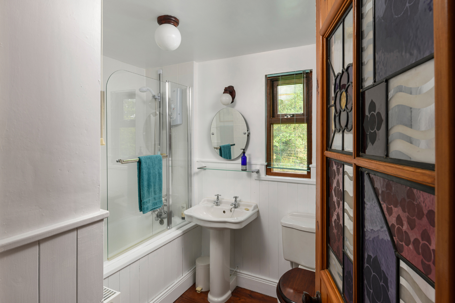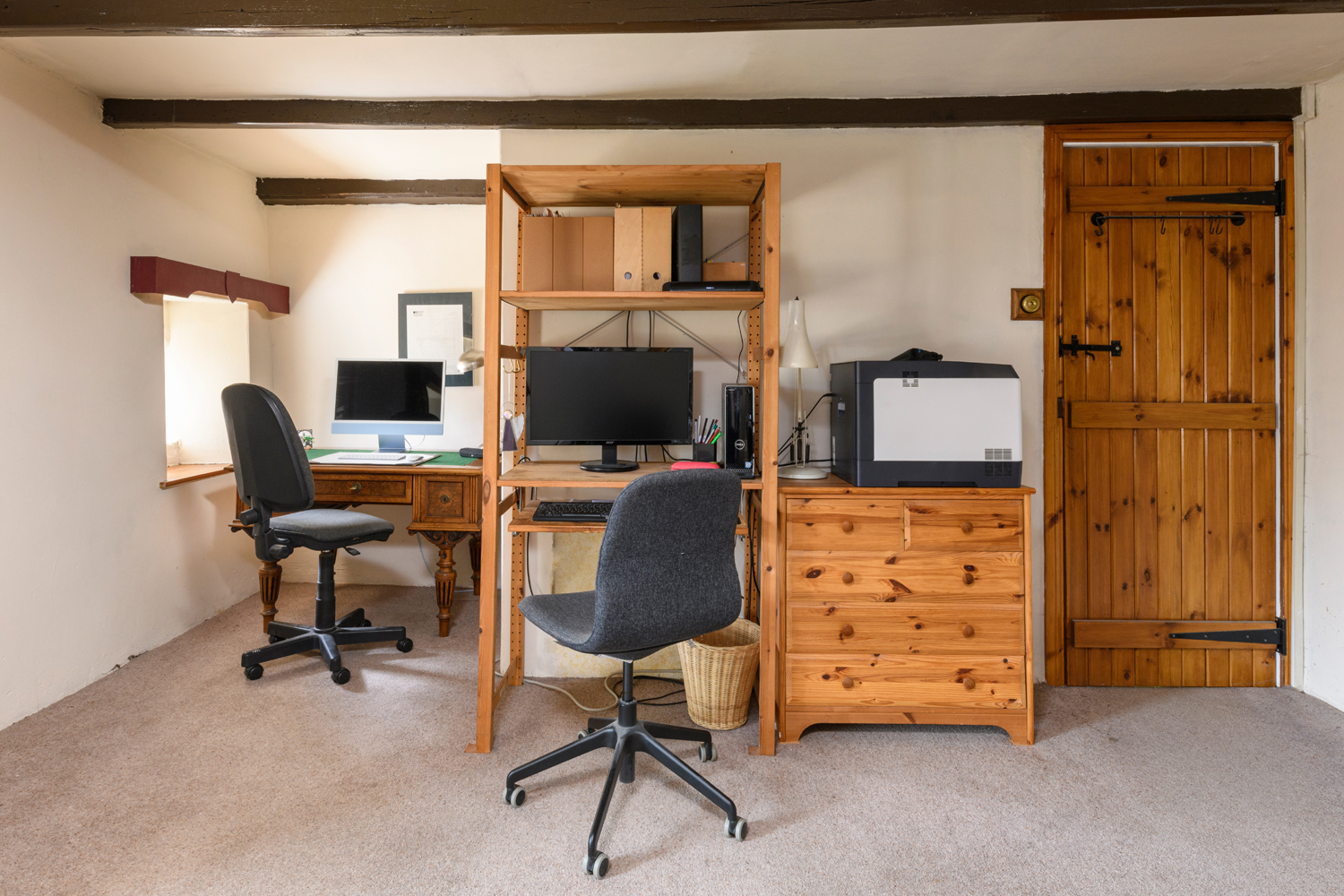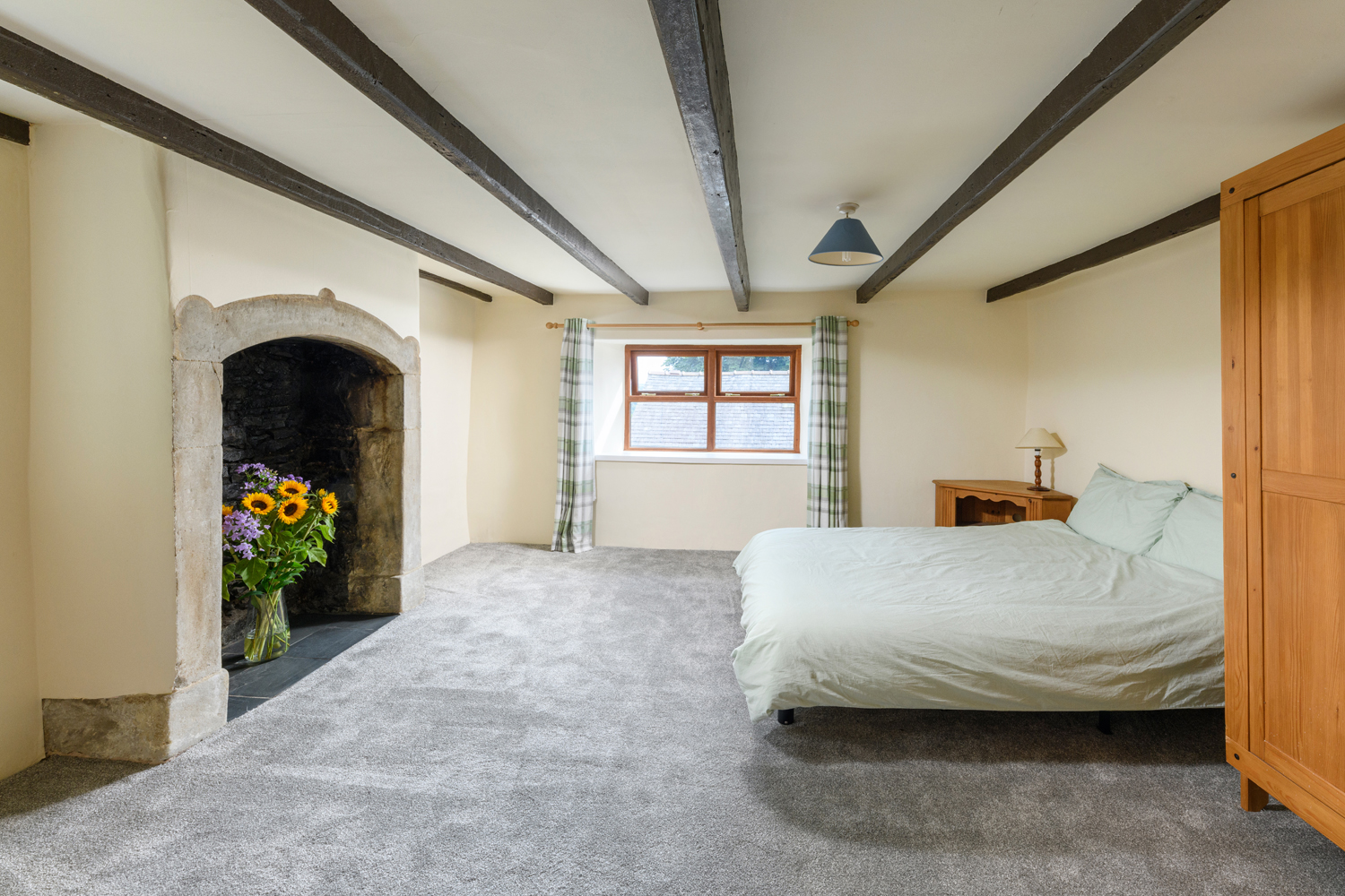 A sitting room and a separate dining room complete the ground floor. The sitting room’s obvious focal point is an impressive inglenook fireplace that houses a Clearview multifuel stove. A recessed window with a window seat provides a lovely outlook across the rear garden, and exposed beams impart a traditional feel.