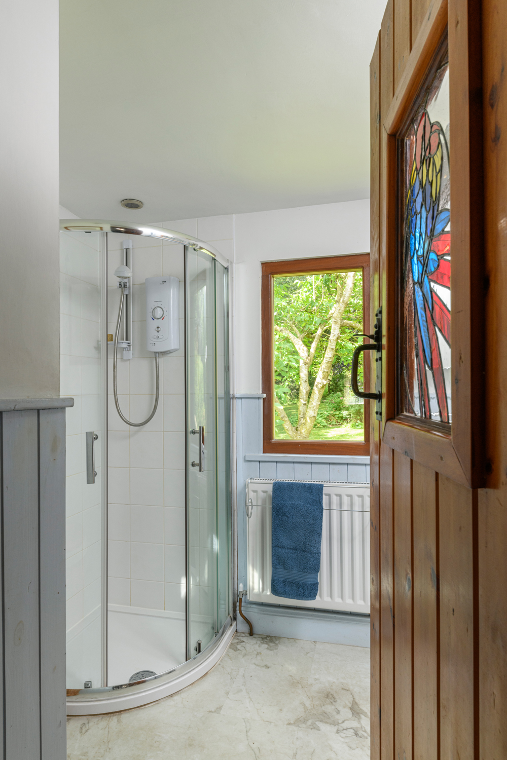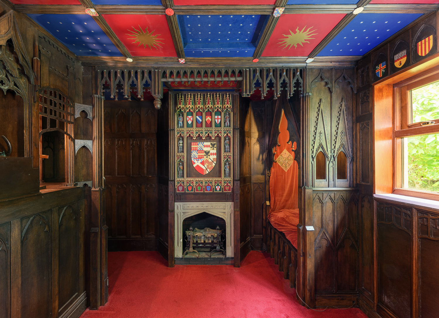 Upstairs, four well-proportioned bedrooms can be found, served by a shower room and a bathroom. The bedroom accommodation is thoughtfully divided, offering enhanced privacy. Each side of the house is accessed via its own staircase, with two bedrooms and a shared bathroom on each side. One of the bedrooms features a unique medieval decorative theme, an obvious choice for a kid’s bedroom.