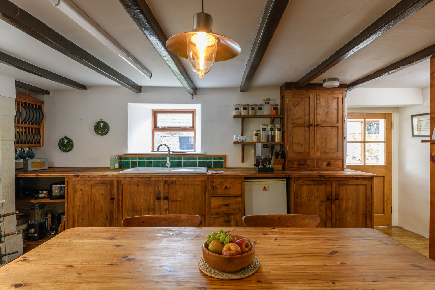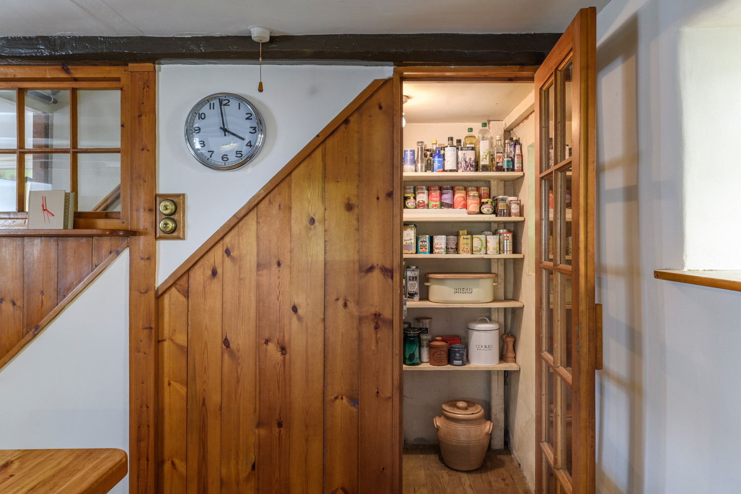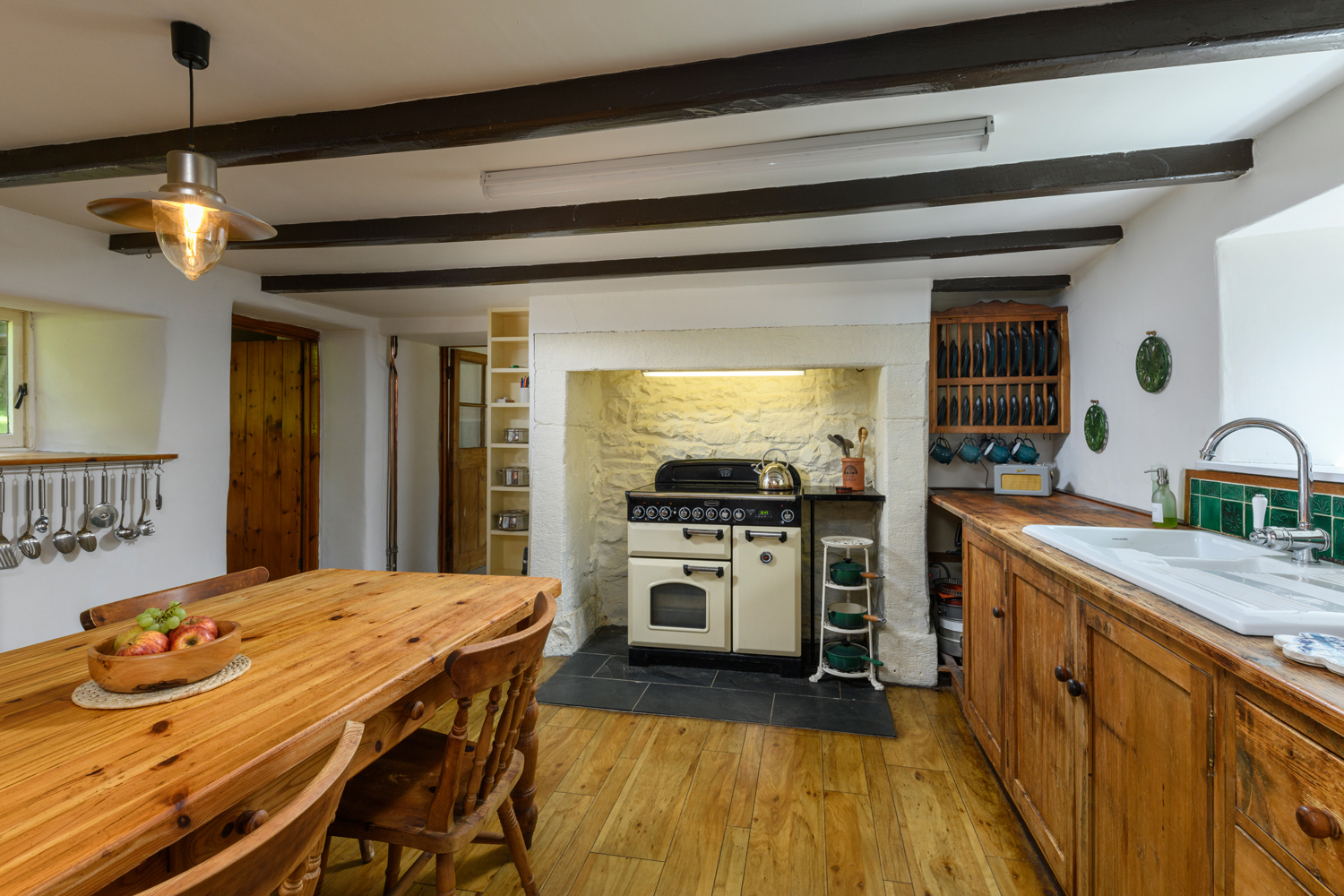 Inside, the property’s living areas are warm and welcoming, showcasing many hallmarks of a quintessential country cottage. The property is entered via a glass-fronted porch, which leads to the main kitchen/dining room. The kitchen features an enduring traditional aesthetic, with wooden cabinetry, a walk-in pantry, exposed beams, and a large inglenook fireplace housing a classic cream Rangemaster. A large utility room sits adjacent with Belfast sink and separate WC.