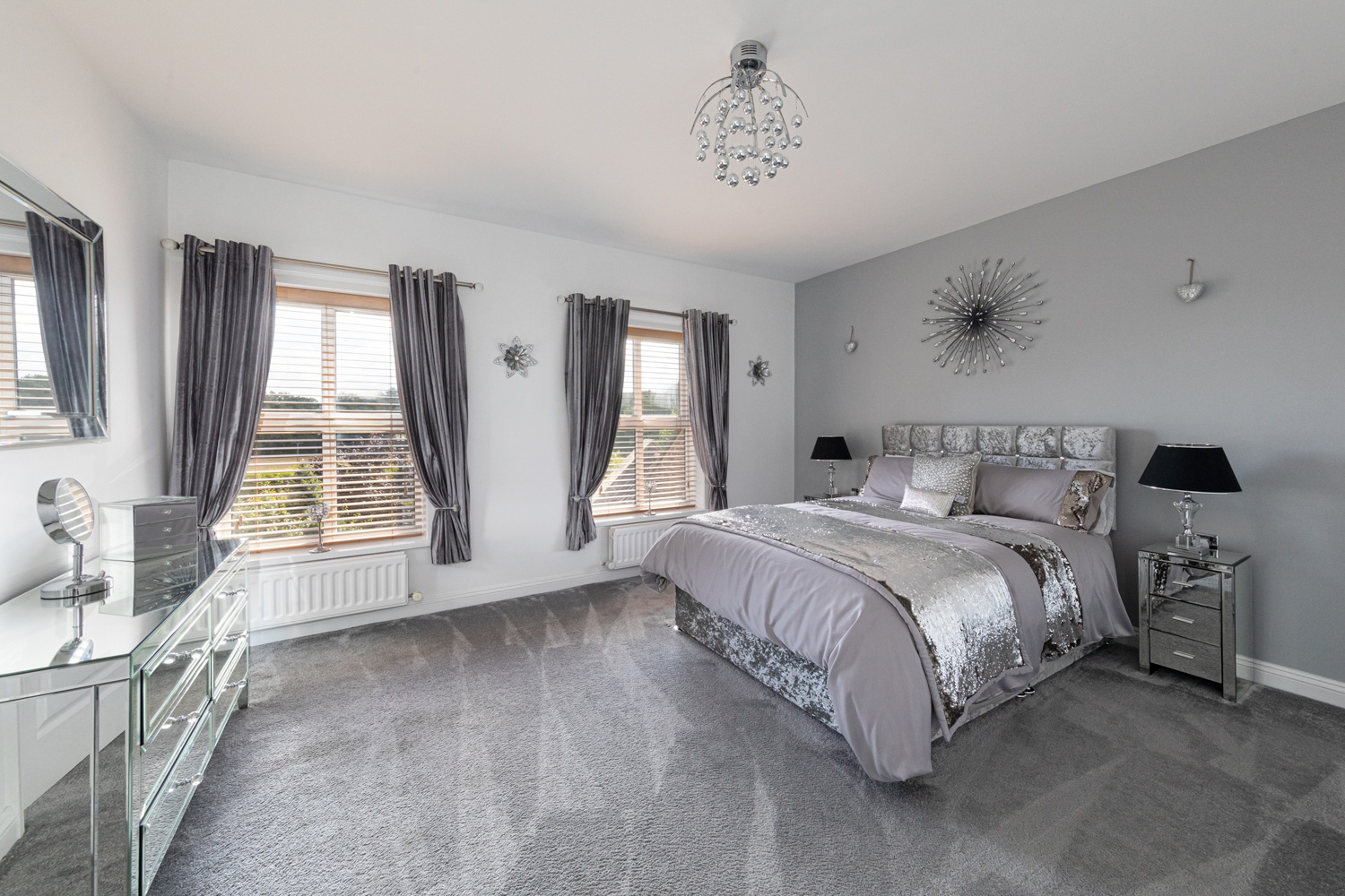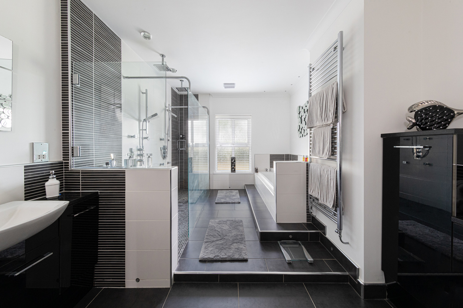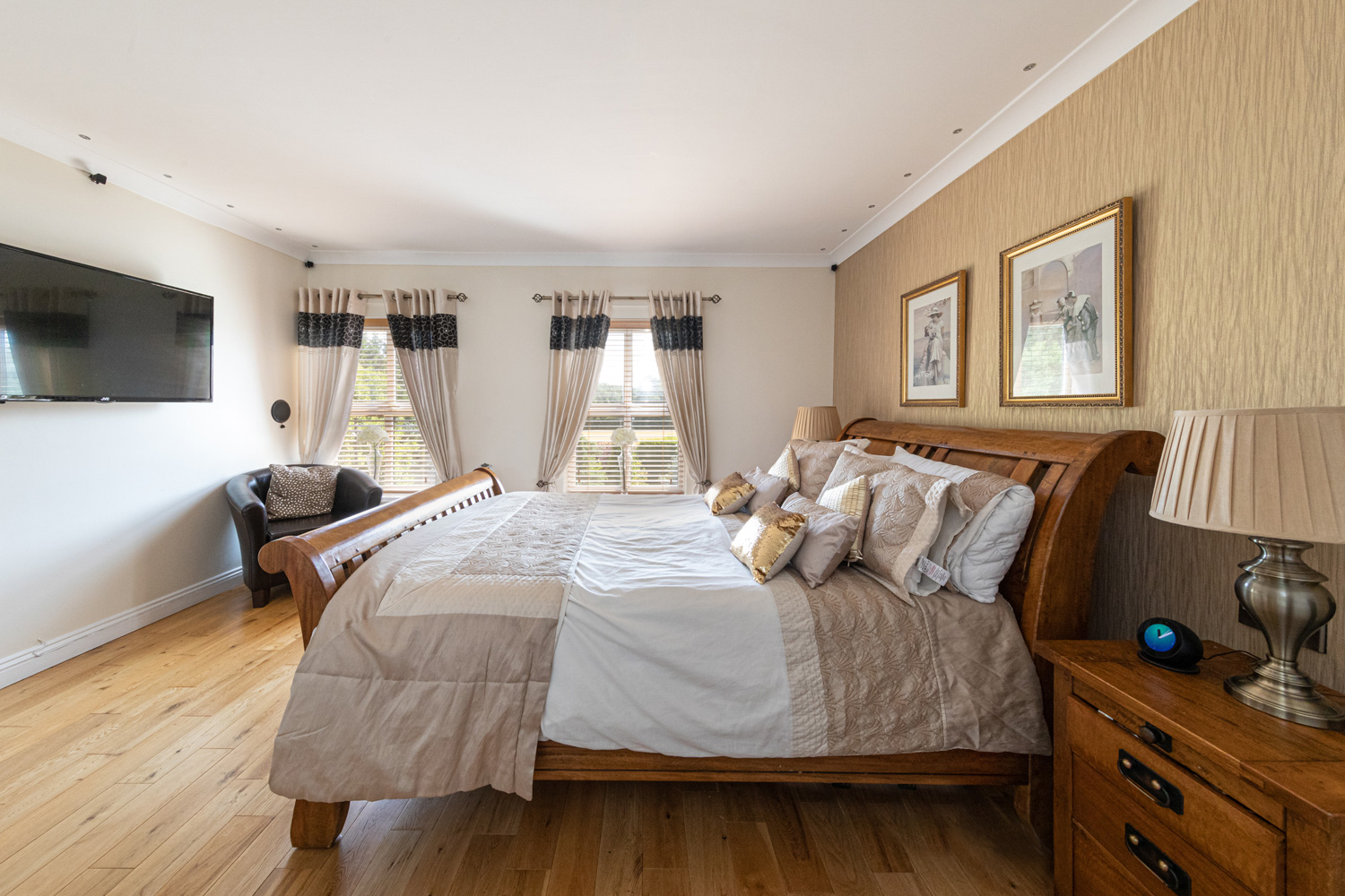 The first floor is arranged around a broad and elegant central landing providing access to four spacious bedrooms. The principal suite offers a true sense of luxury, comprising a beautifully light and airy bedroom, walk-in dressing room, and en-suite. The en-suite features a whirlpool bath with a built-in waterproof digital television, alongside a striking double-ended walk-through shower with dual shower heads and three-way body jets. The remaining three bedrooms are finished to a high standard, with the guest room also enjoying en-suite facilities. The other rooms share a boutique-style bathroom, featuring gleaming travertine tiles, a freestanding bath with a built-in waterproof television, and a walk-in shower with seating that transforms into a steam room at the touch of a button.