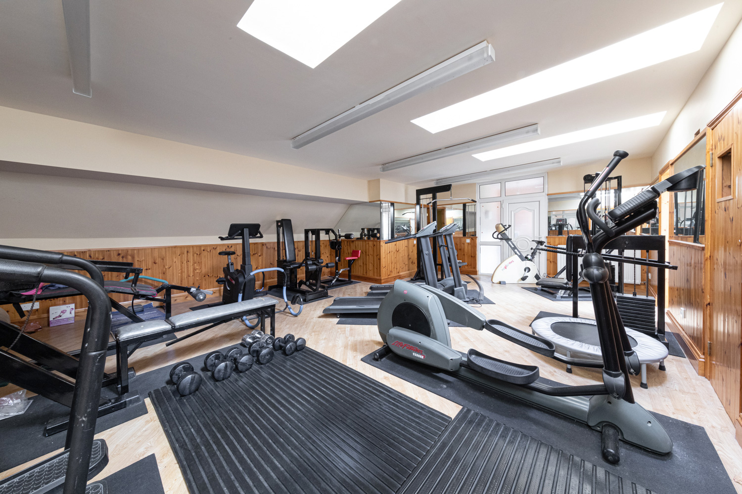 The south wing of Windlestone Manor is dedicated to leisure and wellbeing, arranged over two floors. It includes a gymnasium with space for a range of equipment, along with a sauna, shower room, changing facilities, and a separate room currently used for digital toning tables.