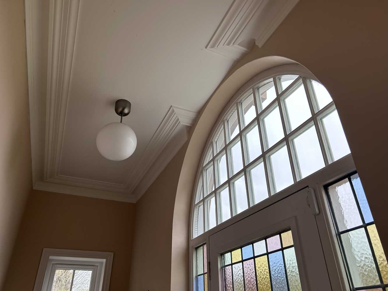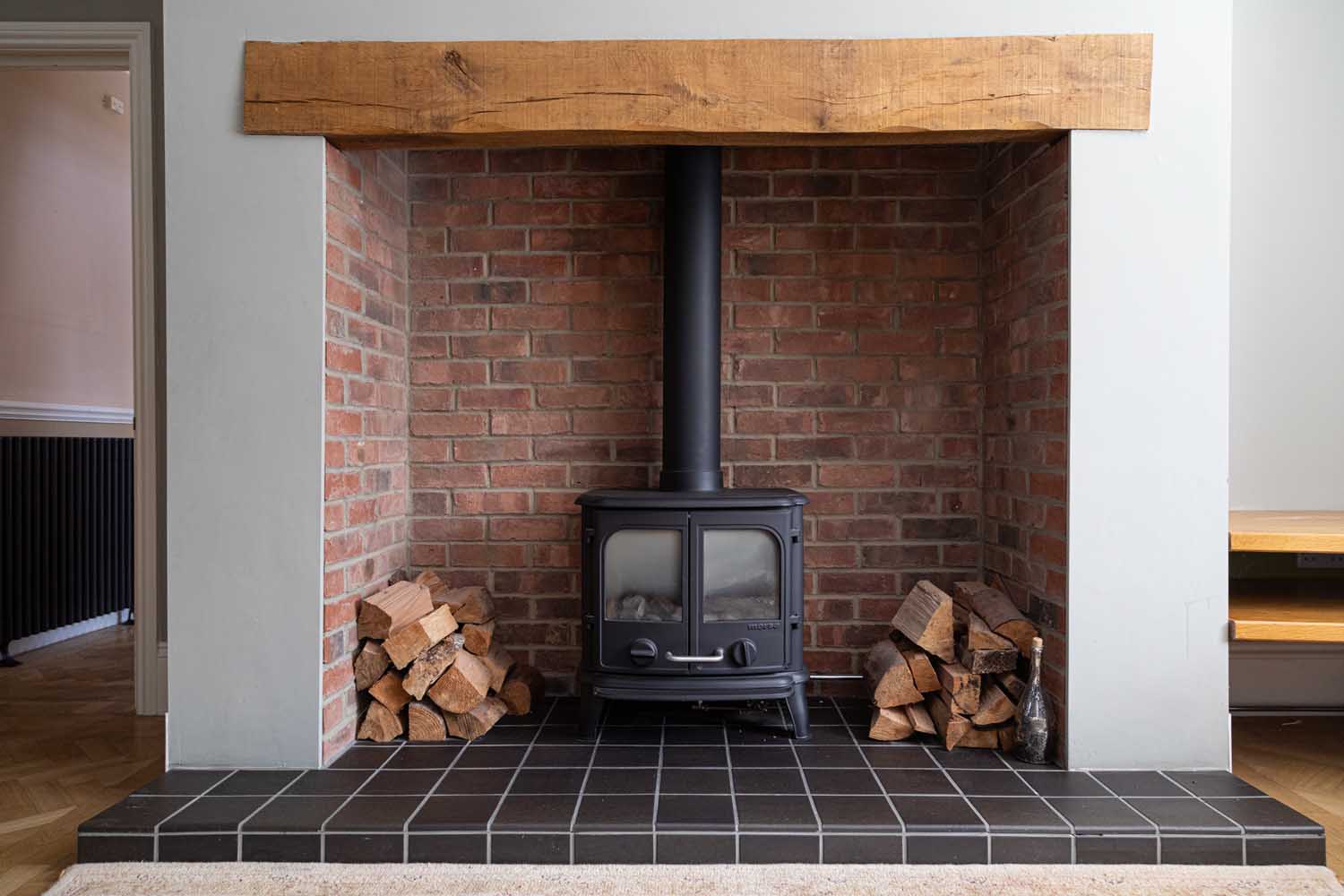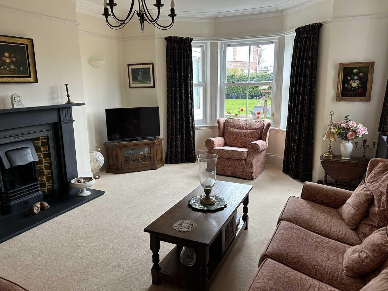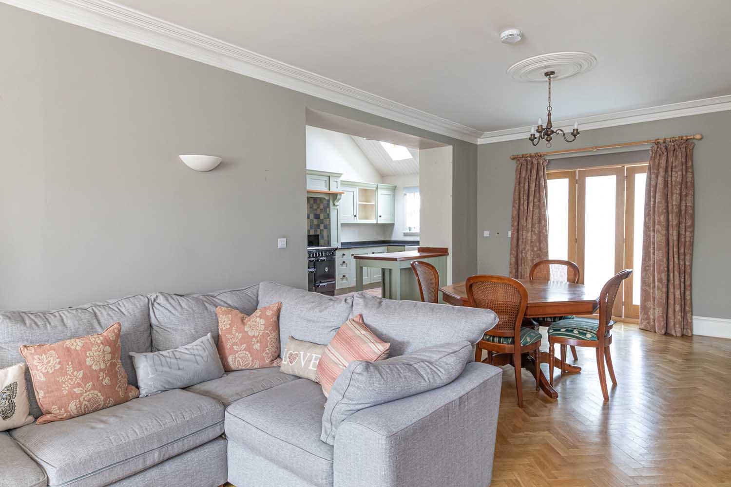 The reception hallway introduces the house with a sense of scale, laid with herringbone flooring and naturally lit by a tall bay window. To one side lies a formal sitting room, centred around a decorative fireplace and framed by a deep walk-in bay. To the rear, the main living space runs the full width of the house — a bright, open room that serves as the everyday hub of the home. French doors open to a side terrace, while a second bay window brings in morning light from the east.