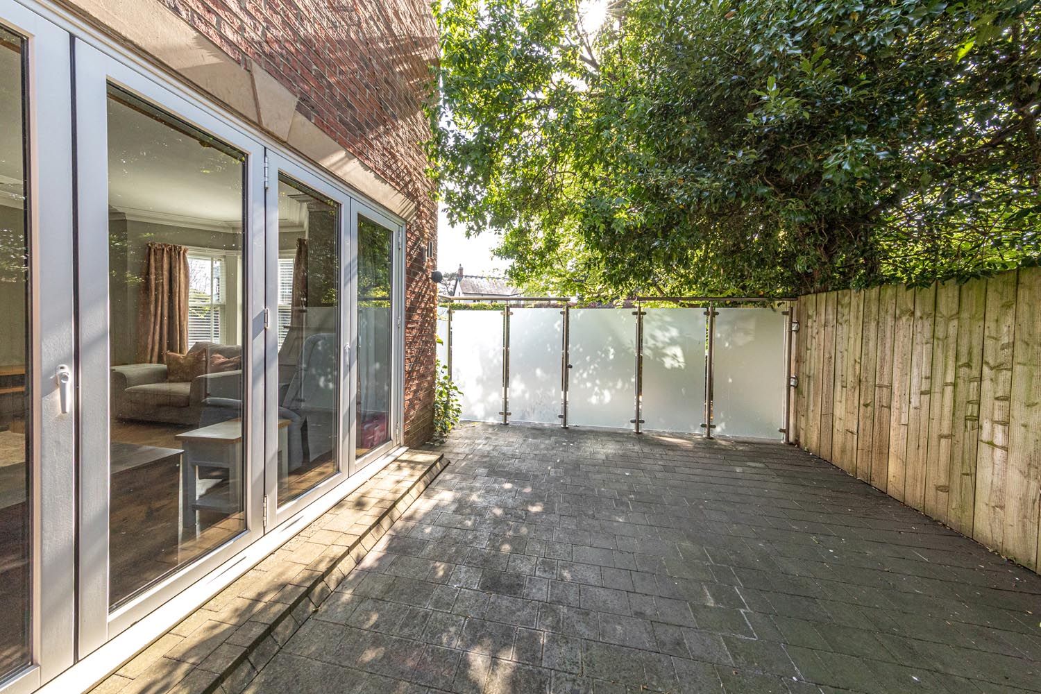 The rear garden is fully enclosed and laid to lawn with well-stocked borders, mature trees, and a stone terrace adjoining the house. The orangery links this space back to the main living area. Triple bifold doors from the lounge open to a separate glass-panelled seating area, and a garden shed provides further storage. A block-paved driveway wrapping around the front of the house provides ample parking. The house also benefits from a recently replaced roofline including barge boards, gutters, and downpipes, designed to be permanently maintenance free.