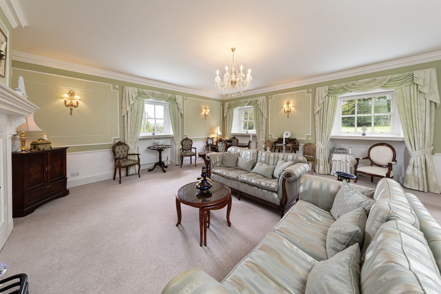 A pair of half-glazed double doors on the west side of the villa open into a welcoming reception hallway and onward to the rest of the apartment. The beautifully appointed drawing room, once the housekeeper’s quarters, is now one of the most impressive rooms in the Hall. As one of the largest, it enjoys a wonderful sense of space and grandeur, enhanced by three elegant Georgian windows offering a dual aspect to the south and west. These flood the room with natural light and frame stunning, uninterrupted views across the open parkland and towards the lake beyond. A striking focal point is provided by the ornate Georgian grate, set within the original stone fireplace, complete with built-in storage cupboards and a substantial mantel above. Two original linen cupboards, set to either side of the fireplace, offer excellent storage. A cloakroom with WC is conveniently located just off the drawing room.